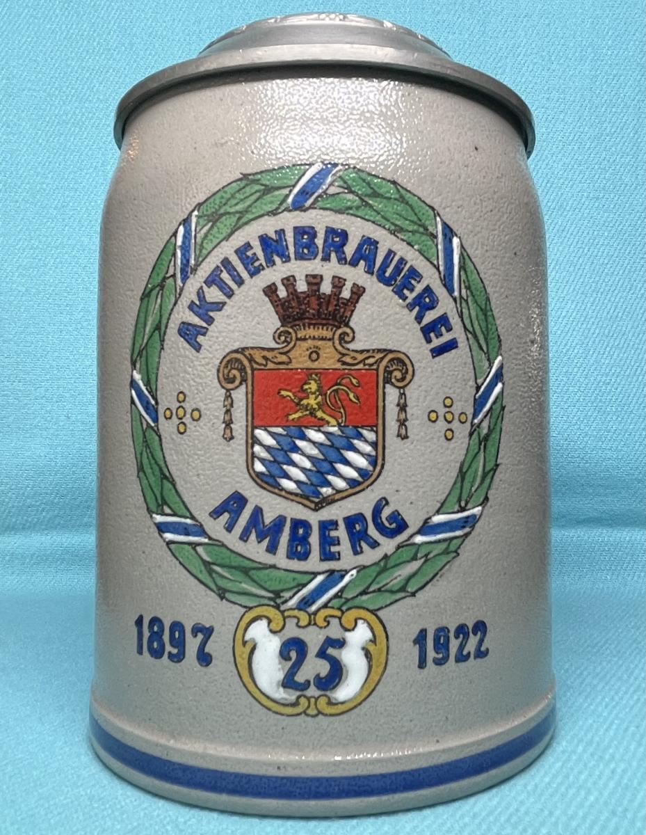 The “25" on the steinkrug is a commemorative 25th anniversary [1897 - 1922] of the Aktienbrauerei. The Brewery Aktienbrauerei [Brauhaus Amberg] was located in Amberg, Bavaria, Germany. I had visited it before its doors sadly closed in 1990. Dawn, my wife, and I use to frequent Nuremberg and its surrounding towns and villages, such as Amberg and Bamberg, to enjoy the many local gausthaus, brauerei, and beerfest. Sure miss those days!