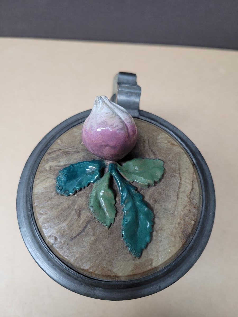 The lid has a radish on top. It has also been seen with a gnome on the lid instead of a radish.