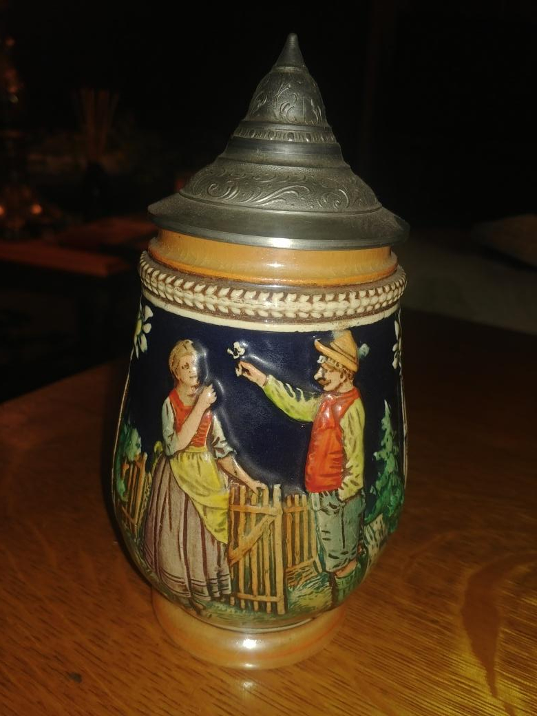 German stein in the rural, country scene of a man and woman standing by a gated fence. There are no Manufacturer's marks on the bottom. I would estimate the stein to be WW2 or shortly there after. Height is of stein itself and not to the top of the lid.