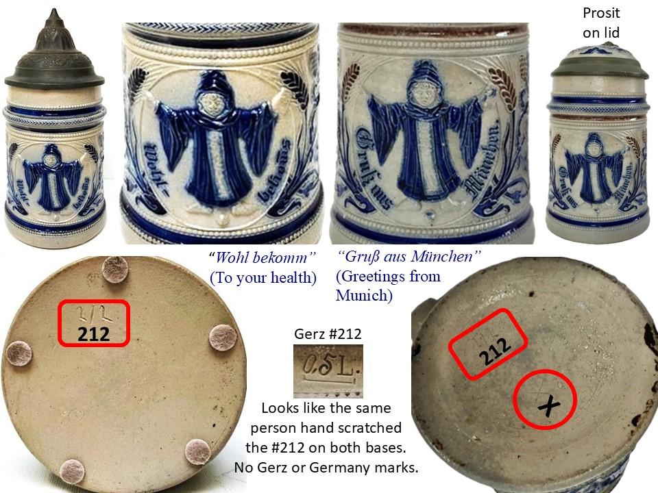 Simon Peter Gerz made steins 1862-1999. This "Munich Child" stein has a 0.5L capacity mark and a hand scribed #212 on the base, it's about 7-1/2" tall. No makers mark or Germany on this stein. 1887 in Germany it was required to have Germany or Made in Germany on all exports. Possibly this stein was made 1862-1886. This heavy three ring pewter hinge was used around 1875-1895. Last pic is of this stein and another #212 with a different saying.