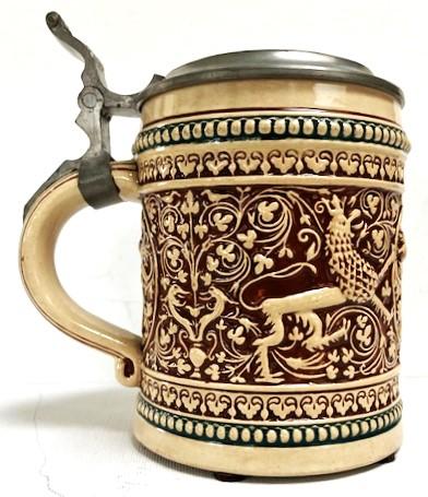Merkelbach & Wick made steins 1872-1921. This "Griffins with Coat-of-Arms" is about 6" tall with the mold #446 in a large circle under the handle. 1/2L capacity mark and the circular M&W logo on the base, but no Germany. In 1887 it was required to have Germany or Made in Germany on all exports. This was certainly an export stein for Charles Zoller, a brewer, furniture sales and reupholstering store and a pioneer in the Kodachrome photography from New York. It has compliments of Charles Zoller on the pewter lid.