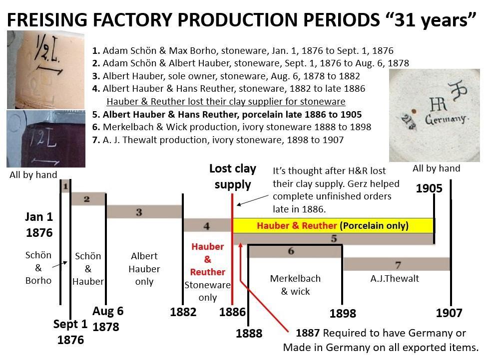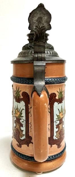 Made in the Freising factory by Hauber & Reuther 1886-1905 porcelain production period. H&R lost its clay supply for stoneware in 1886 and started producing porcelain, they could use the local clay in that area. Their porcelain steins were thicker and heavier and never had lithophanes. At first, they had a lot of problems with breakage. When porcelain is fired it shrinks as much as 20-30% but because the clay throughout is the same density when it comes out of the mold, this is usually not a problem. However, if you stamp anything into the clay, the clay is compressed by the stamp and is a different density than that surrounding it and when fired will shrink at a different rate often causing the piece to pull apart. For that reason, the stamped marks had to be replaced by marks that are less intrusive. The HR logo was lightly scratched in and painted over. A lot have two HRs on the base, the second is a decorator HR mark, it was only painted on as was the Germany. Capacity marks at first were stamped and soon all were painted on. Mold numbers can be stamped, painted on or just scratched in. The "Geseztlich geschutst" marks are only stamped in or missing. All the ones I have seen on stoneware steins don't have a capital G. This one has a stamped "Geseztlich geschutst" (hard to see) and a painted on mold #2/48 "2" is the mold number and 48 is the hand painted scene. This stein is about 6" high and about 8-1/4" to the top of the pewter lid. It has HB RZ under the pewter lid.