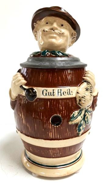 Merkelbach & Wick made steins1872-1921, this "Exerciser in Beer Barrel" is about 7-3/4" tall and has a hard to see 1/2L capacity mark. M&W made this for J. Reinemann of Munchen a merchant. It doesn't have a M&W logo, mold number or Germany on the base, but it does have GESETZLICH GESCHUTZT as seen on many M&W steins. It has "Gut Heil" (Good Health!).