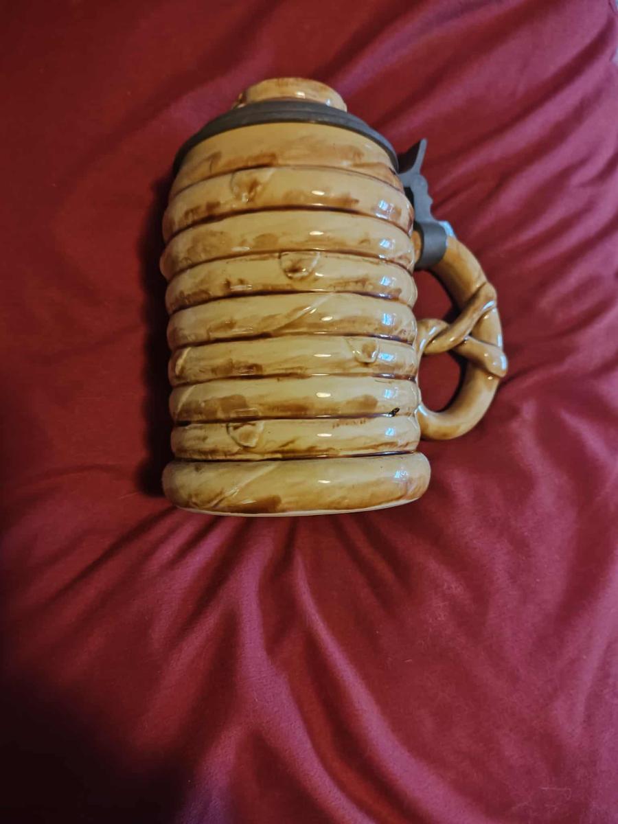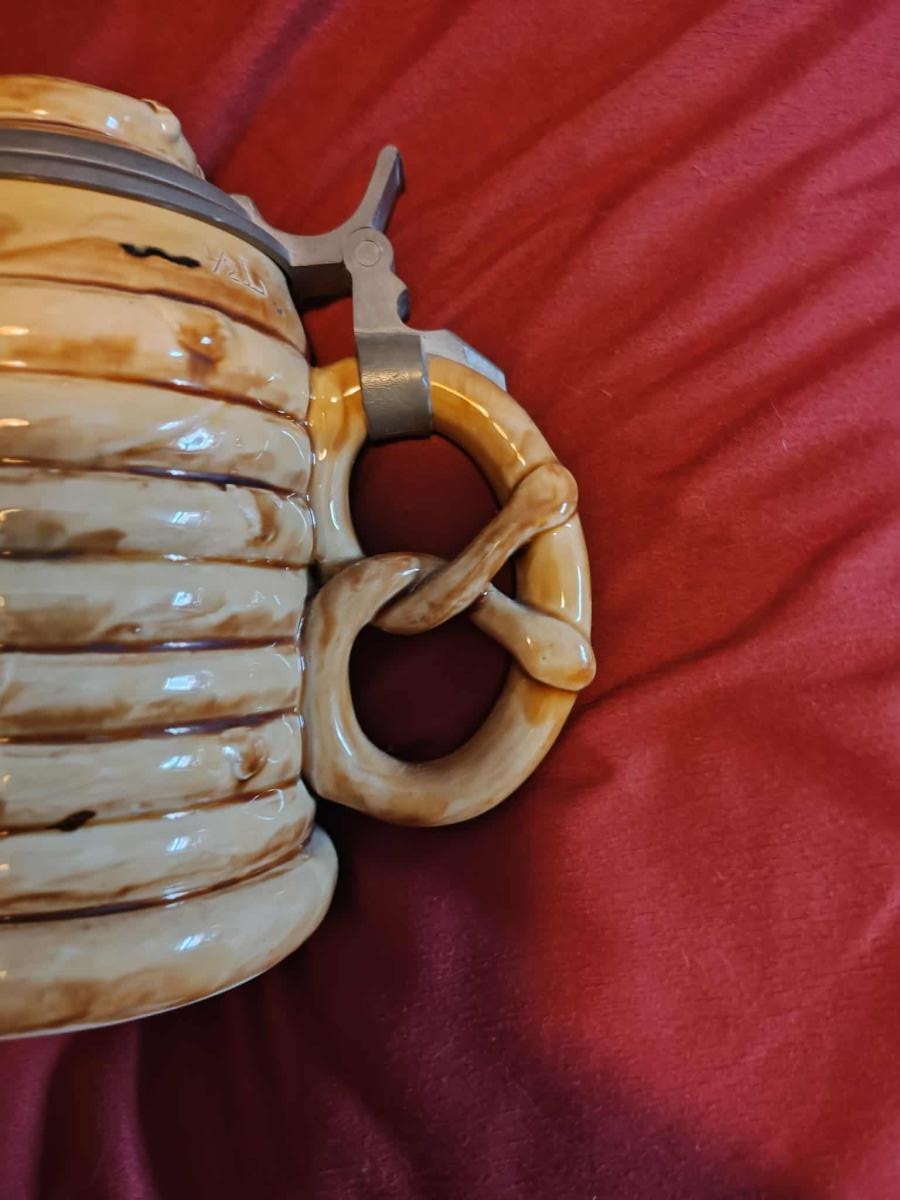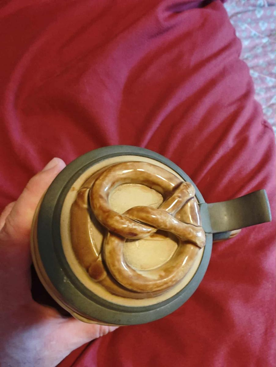Pottery, figural, 0.5L, figural inlaid lid (pretzel), pretzel handle.