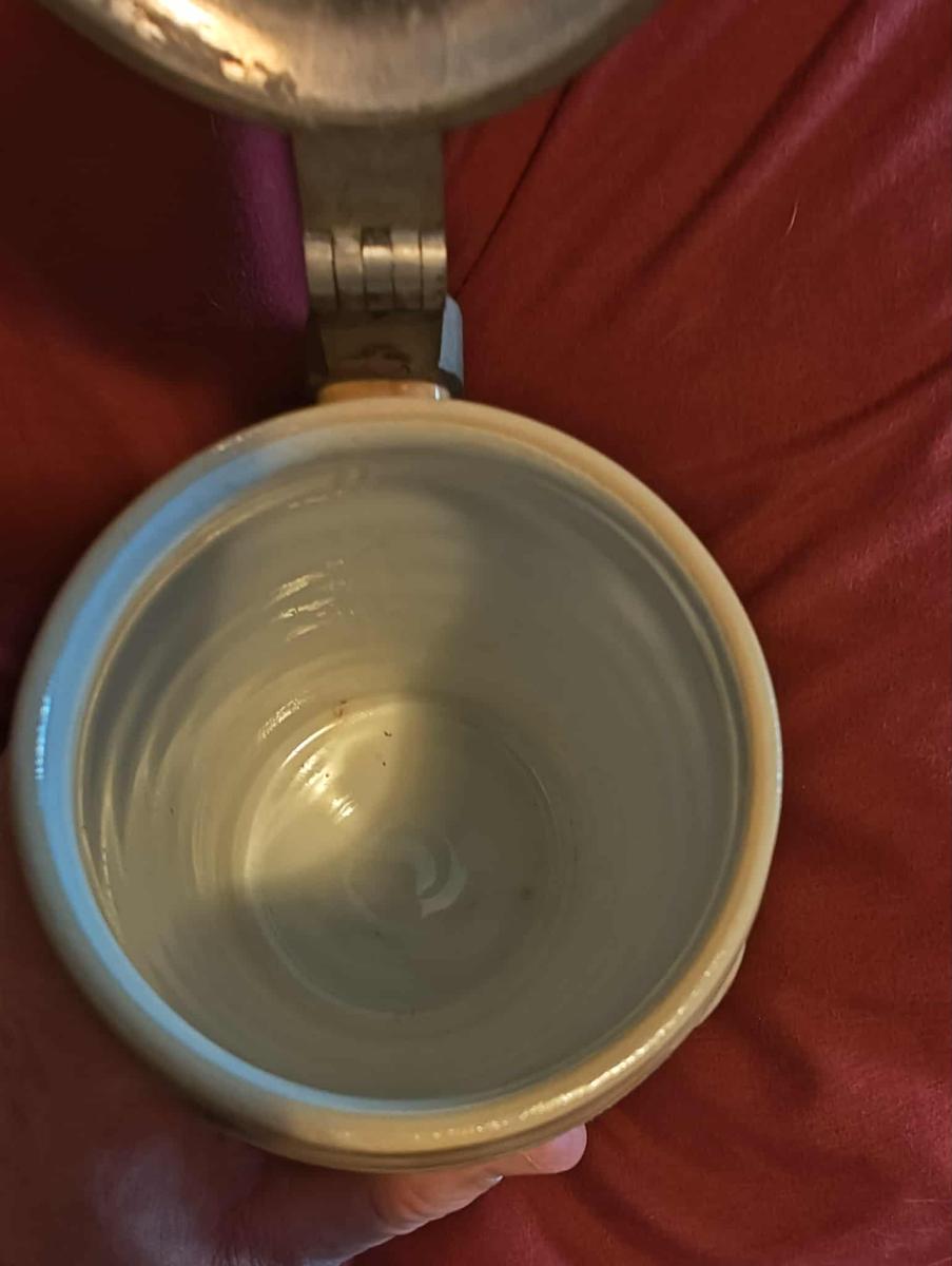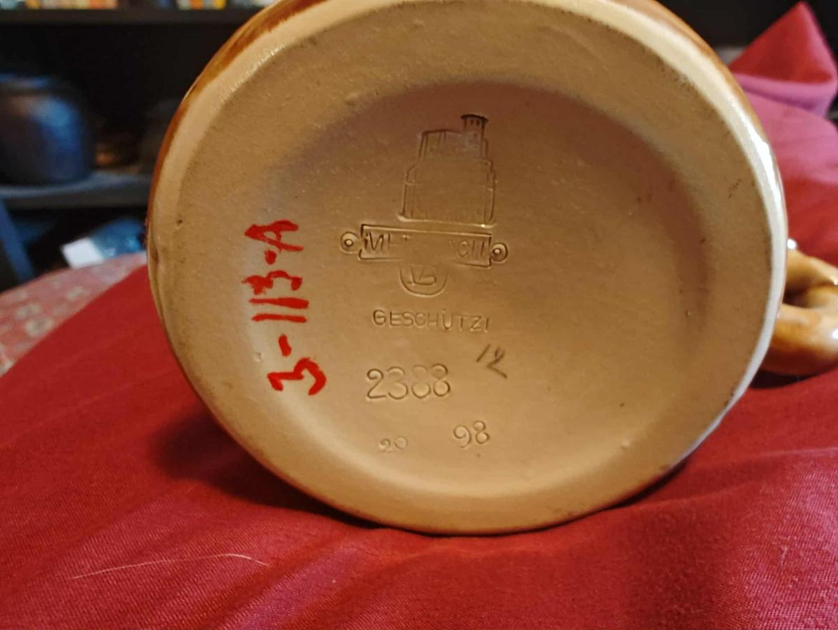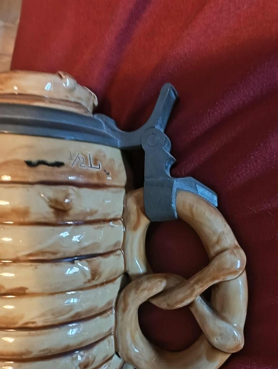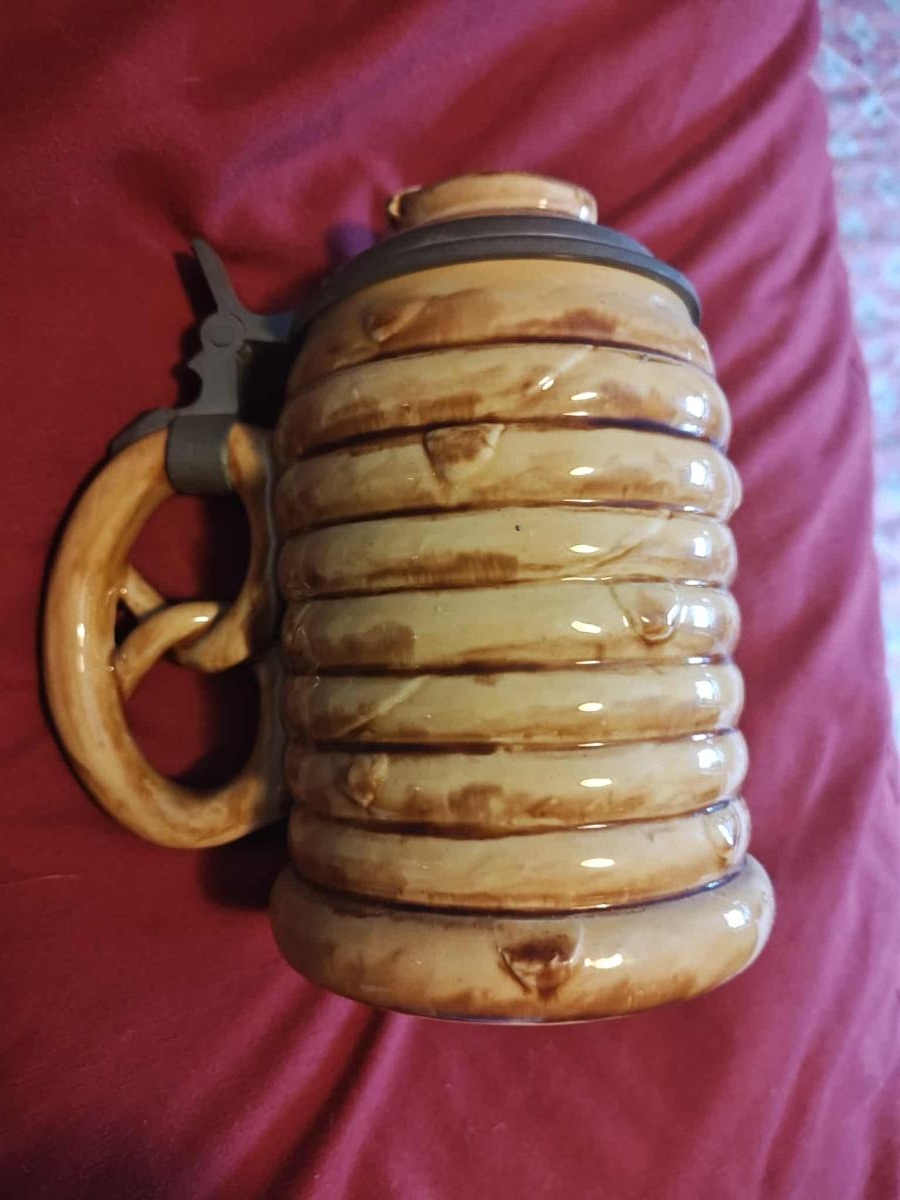 Pottery, figural, 0.5L, figural inlaid lid (pretzel), pretzel handle.