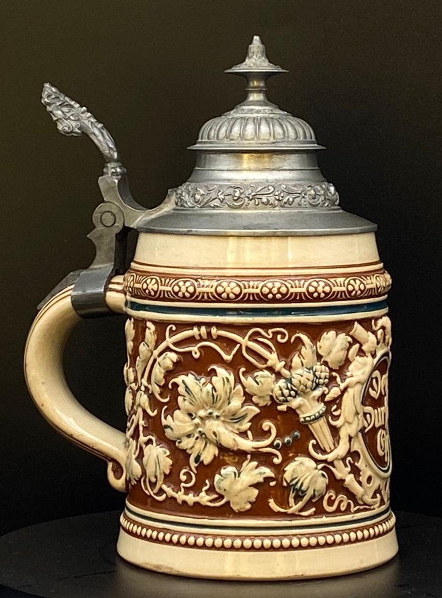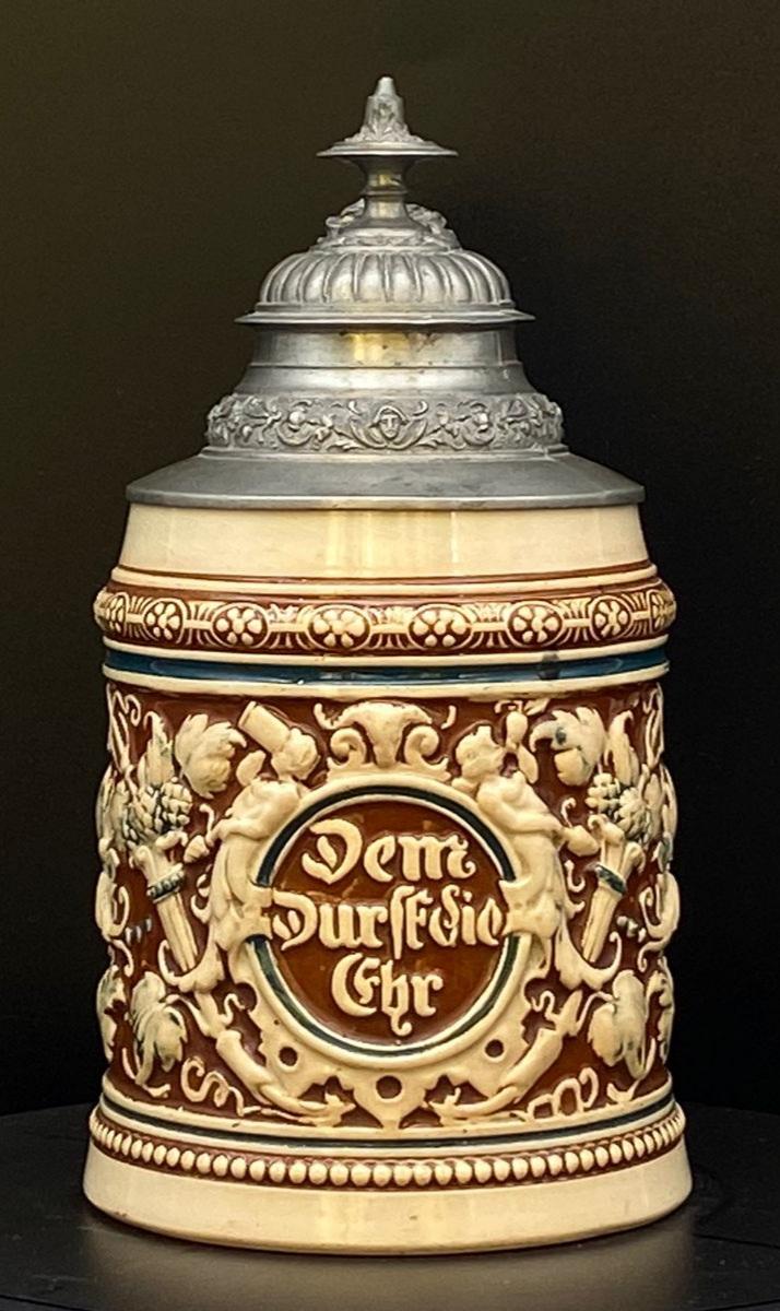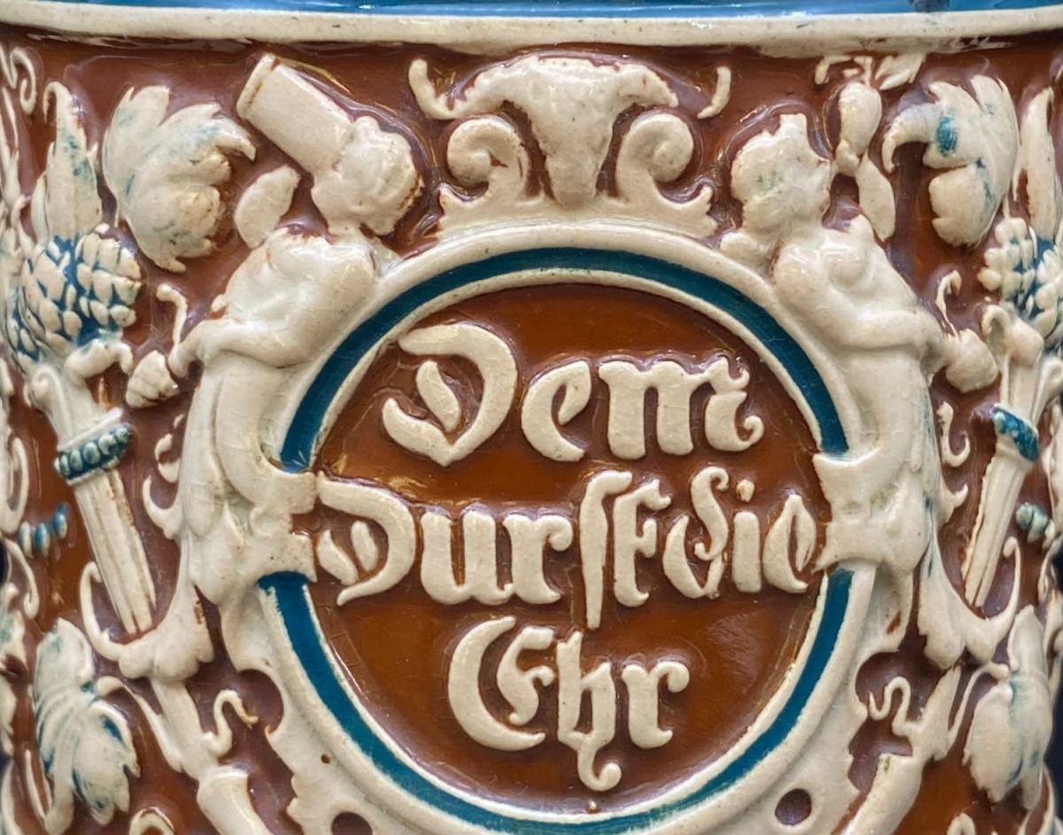 The front of this beer mug has the inscription "Dem Durst die Ehr," which can be translated as "Honor to Thirst" or "In Honor of Thirst."