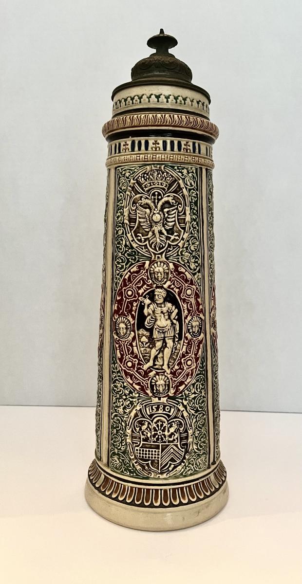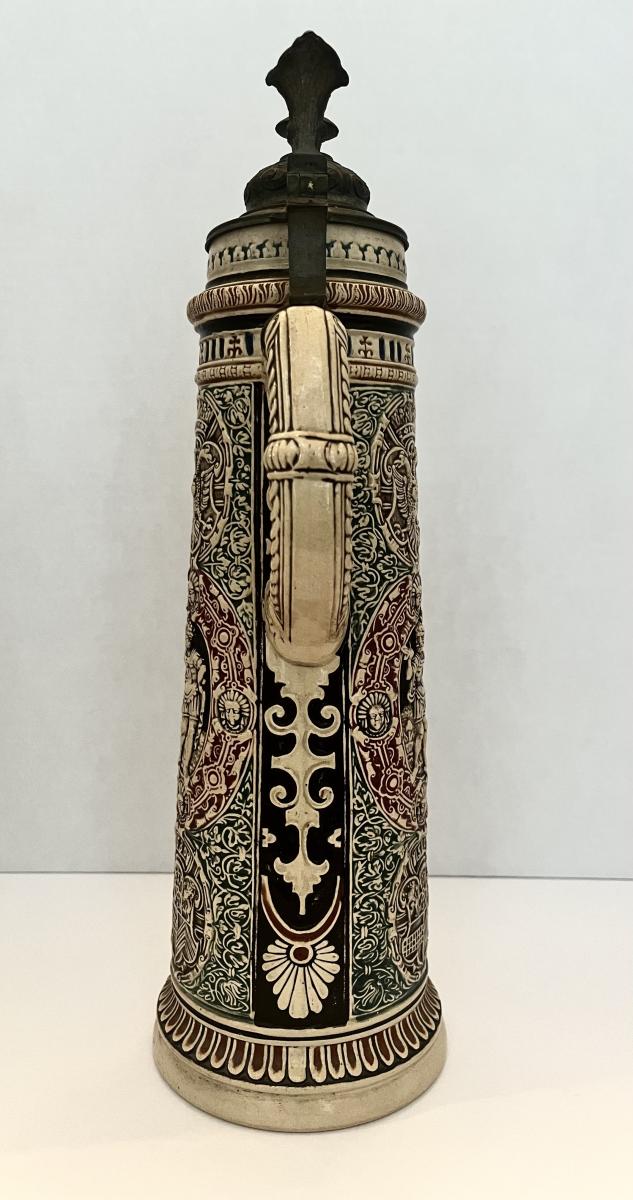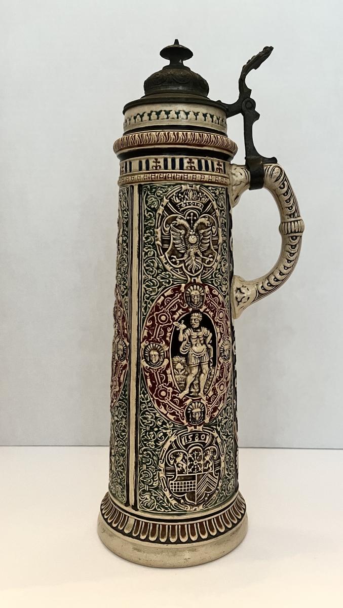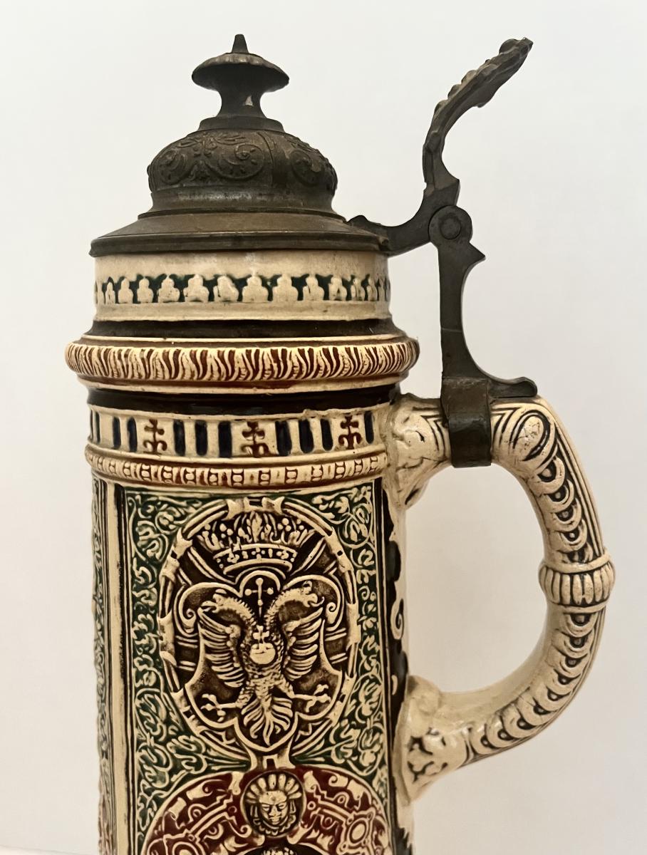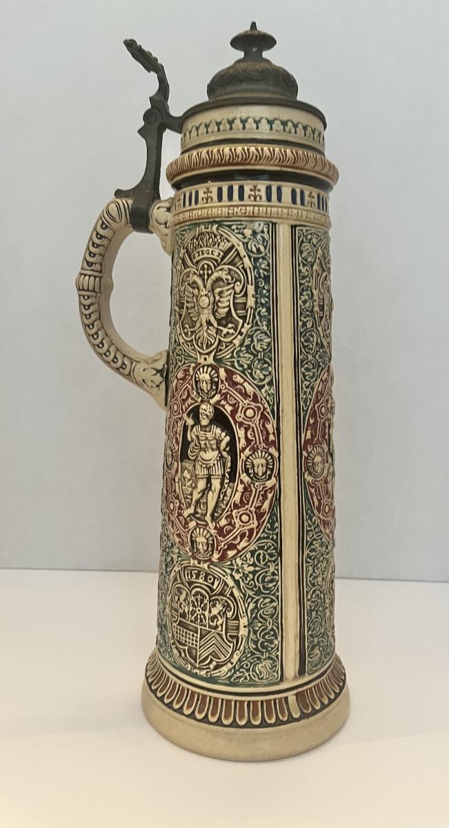 Dumler and Breiden 1.5 liter relief stein depicting heraldic symbols of the Romans, and the Habsburg family.