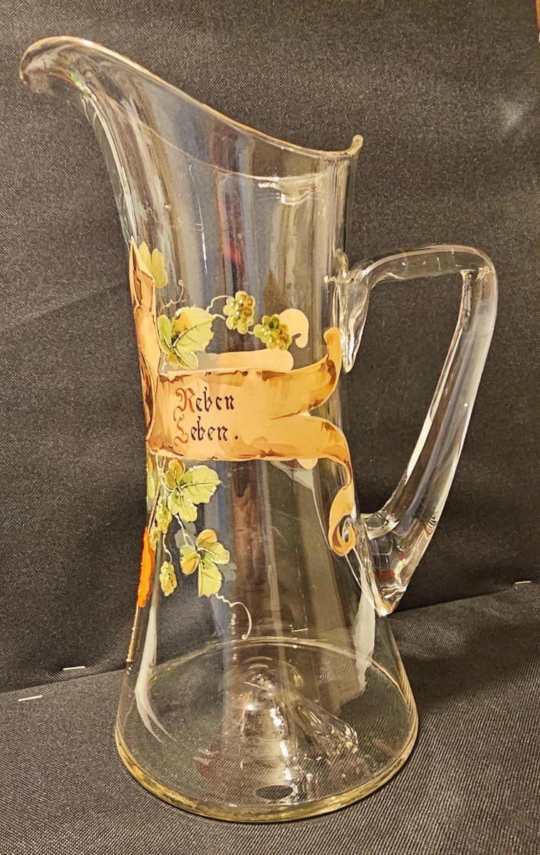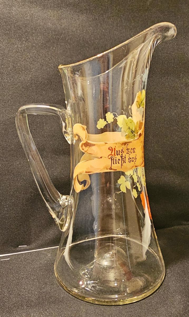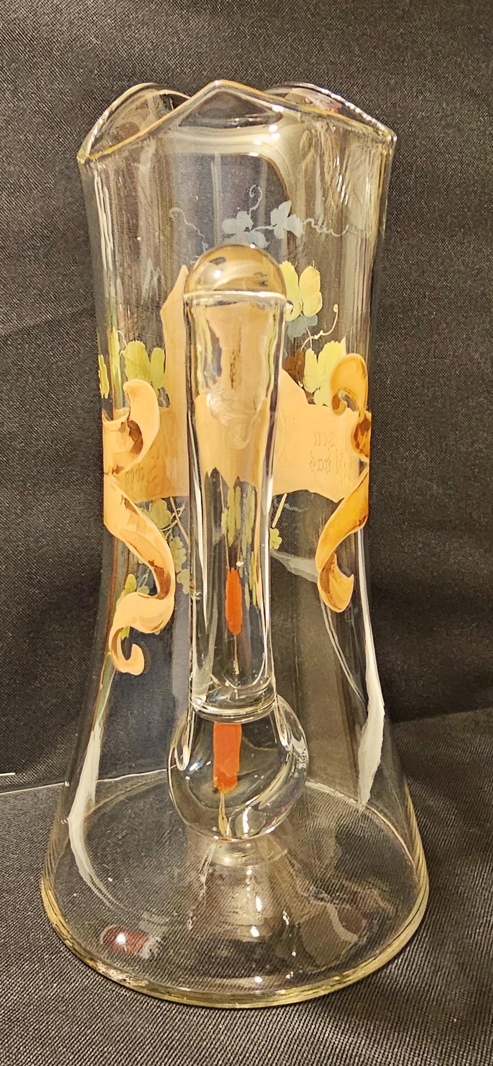 Clear blown glass pitcher about 10 inches high with enamel paint of a monk looking drinker with vines (grapes? Hops?) and a red-orange emblem of a goblet with two stars on each side of it. Small crack at handle