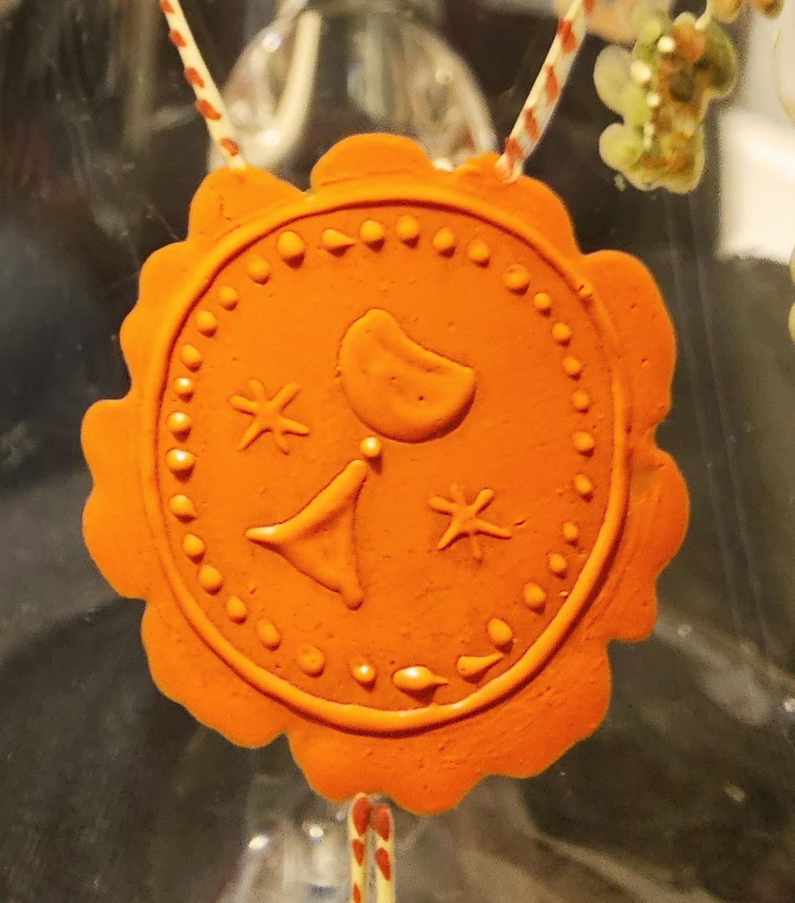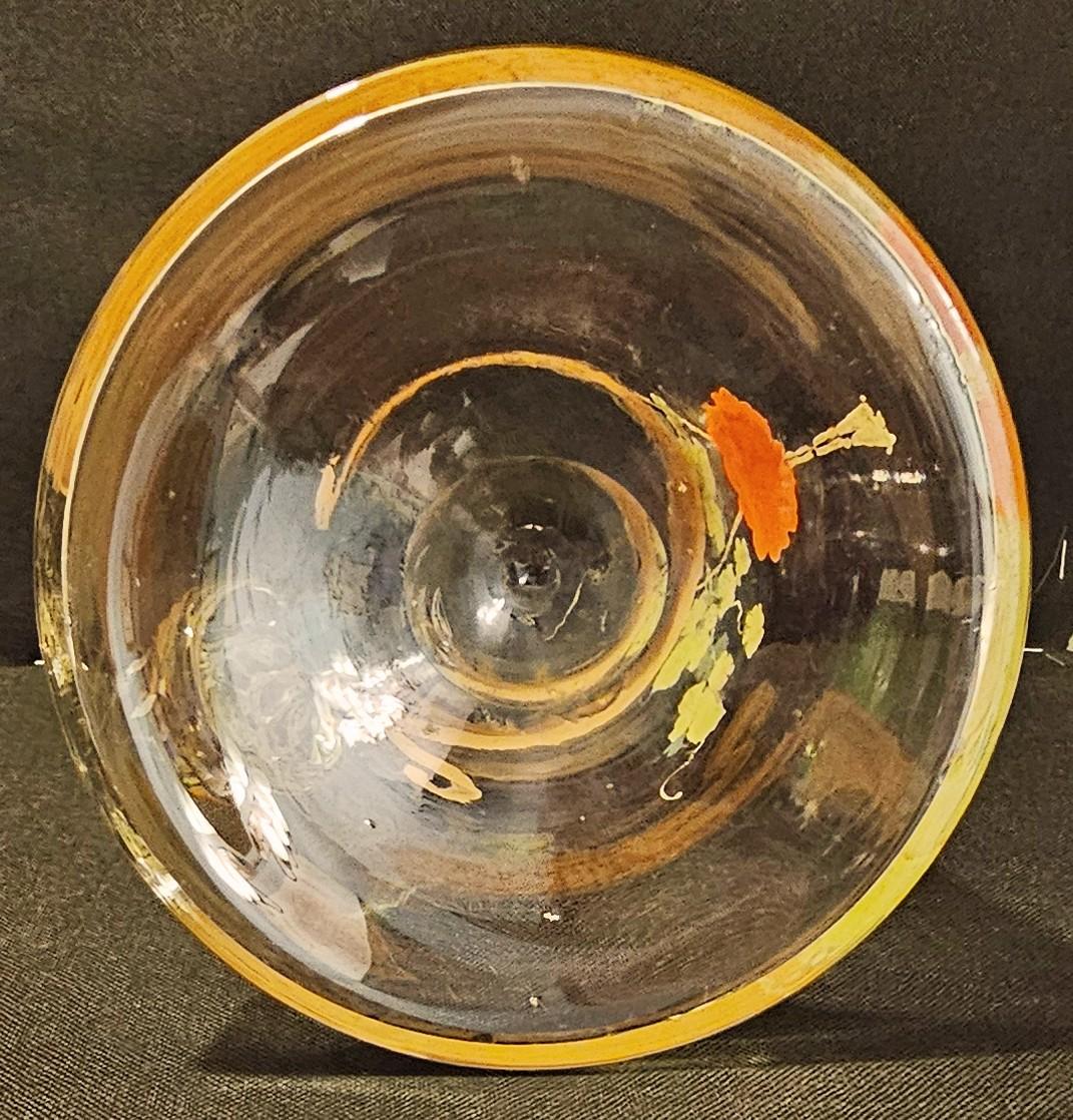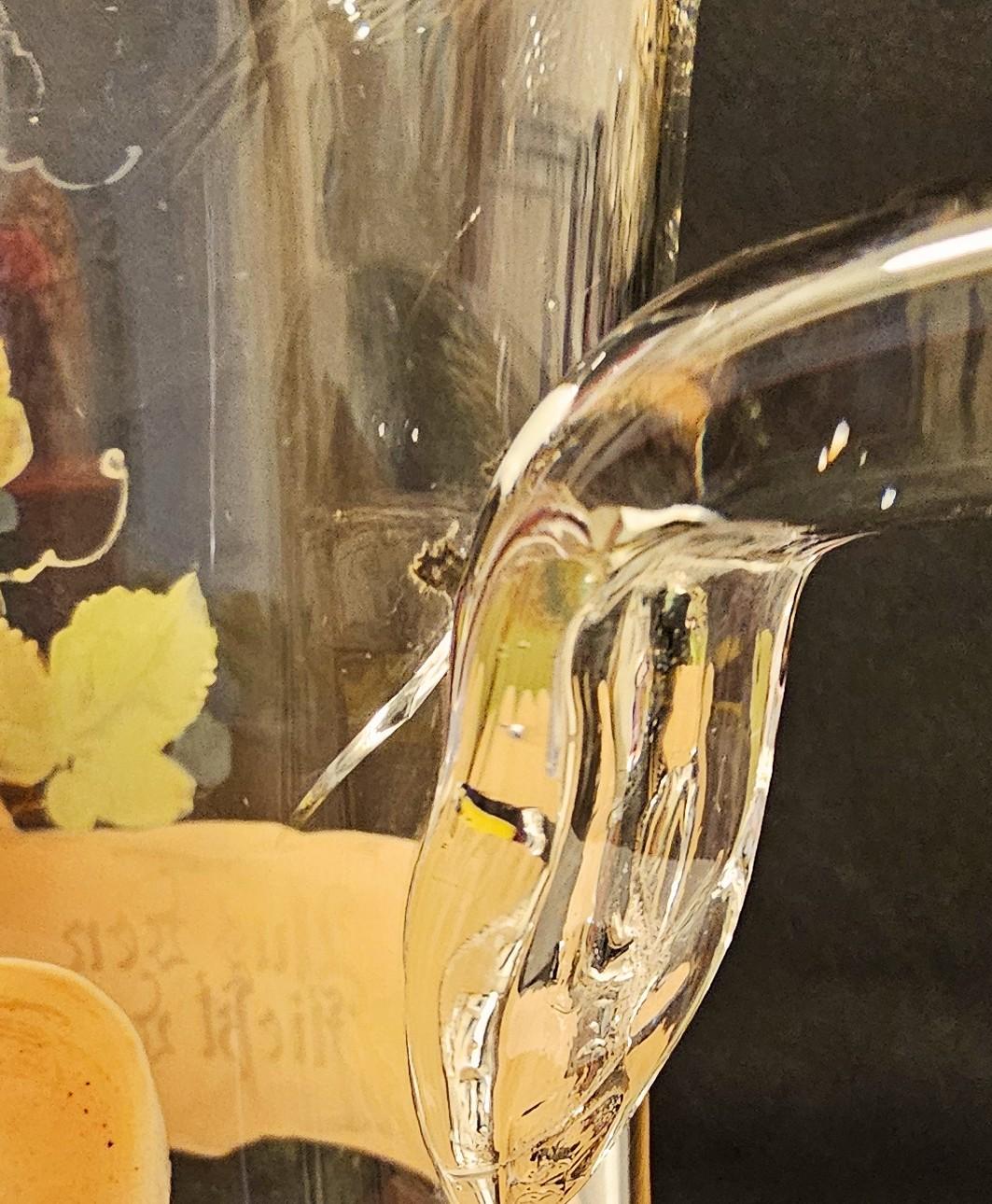 Clear blown glass pitcher about 10 inches high with enamel paint of a monk looking drinker with vines (grapes? Hops?) and a red-orange emblem of a goblet with two stars on each side of it. Small crack at handle