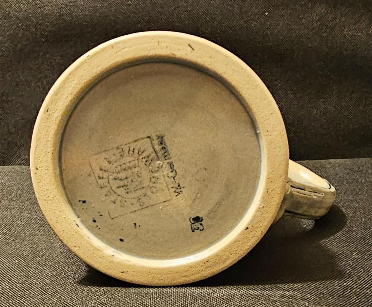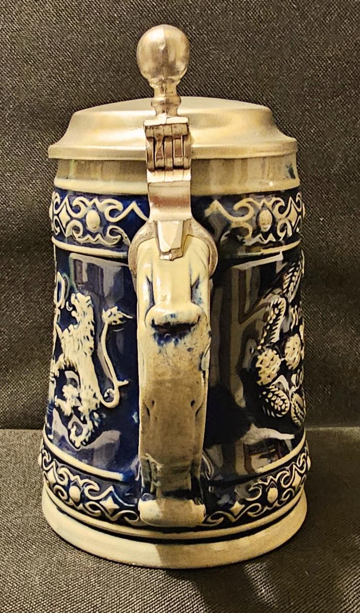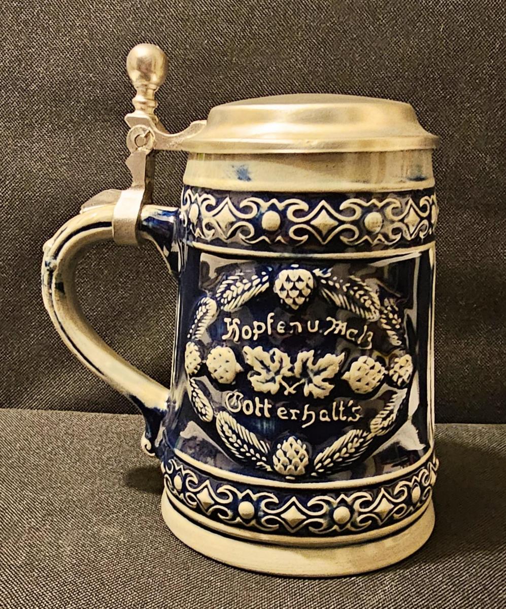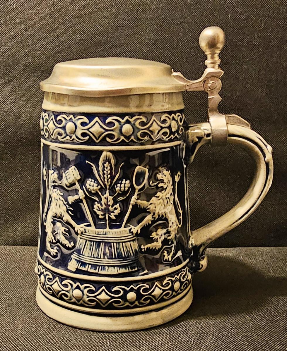 Gerz 1/2 liter stein in blue and gray depicting hops and malt on one side and 2 lions mixing beer on the other. Plain metal lid