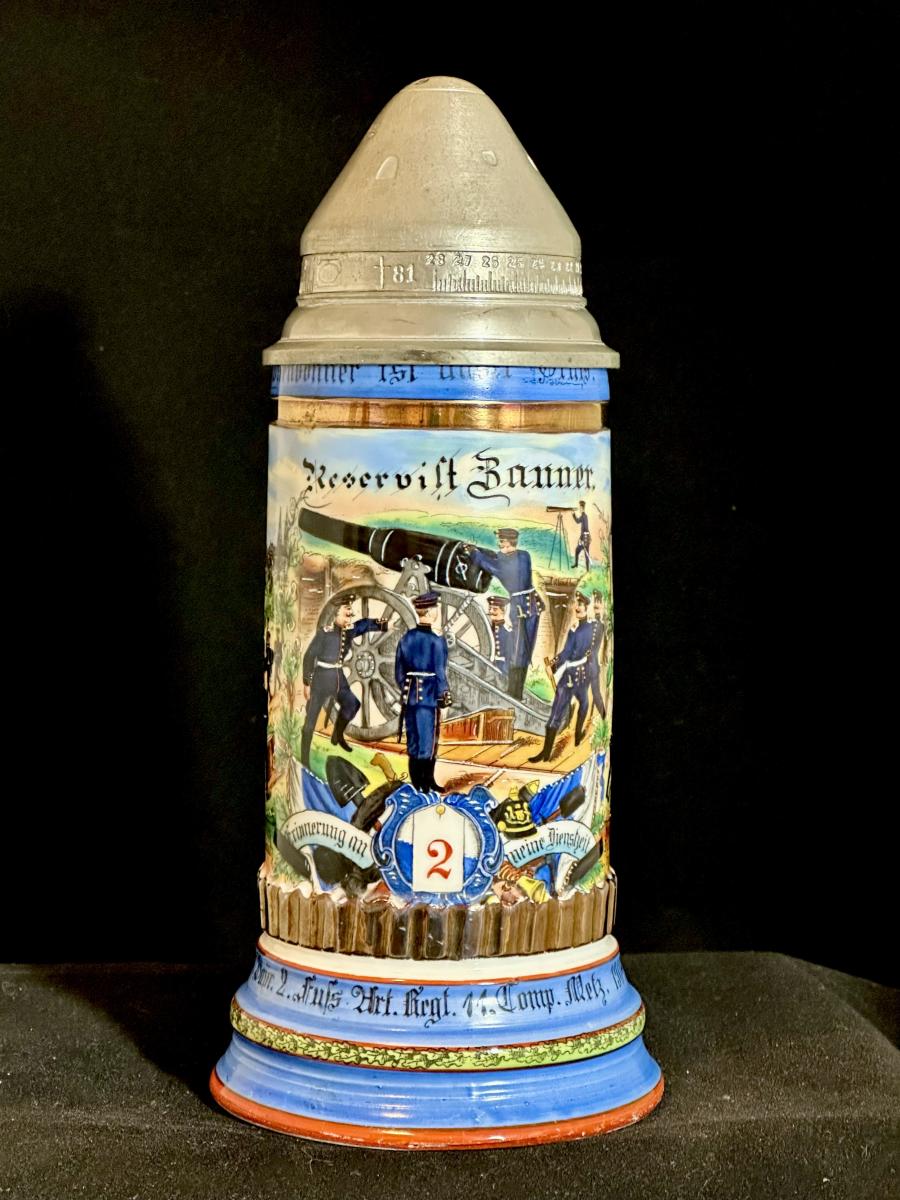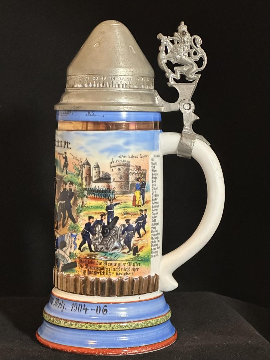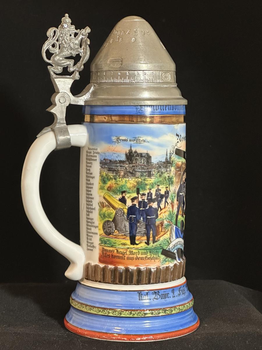 1/2 liter porcelain stein named to Reservist Banner 2d Fuß Artillerie Regiment 11. Co., Metz, 1904-06 (2d Royal Bavarian Foot Artillery Regiment, 11th Company, Metz 1904-06).