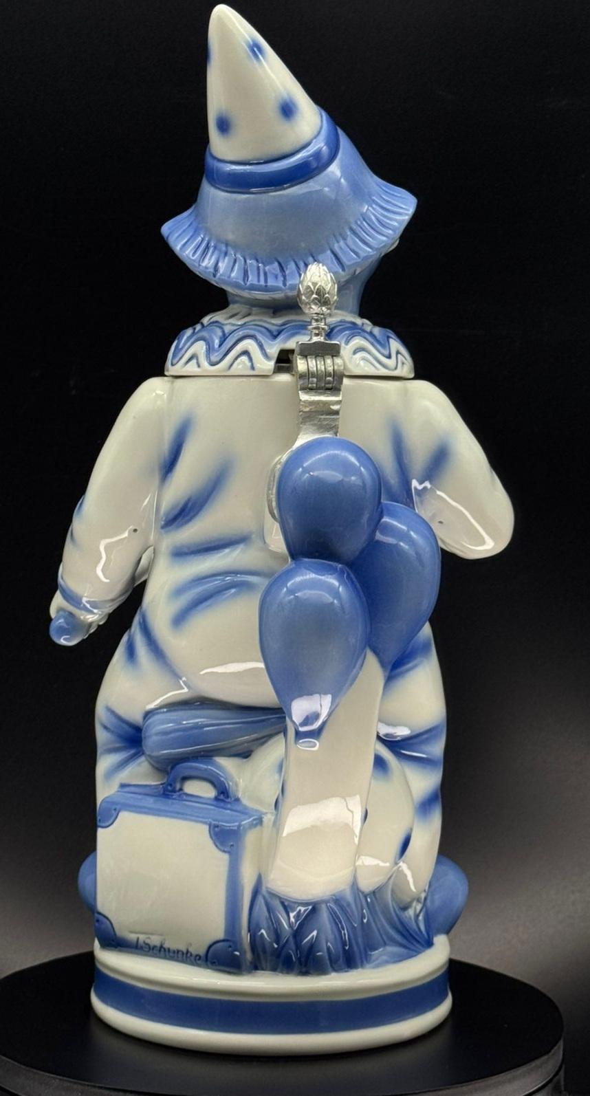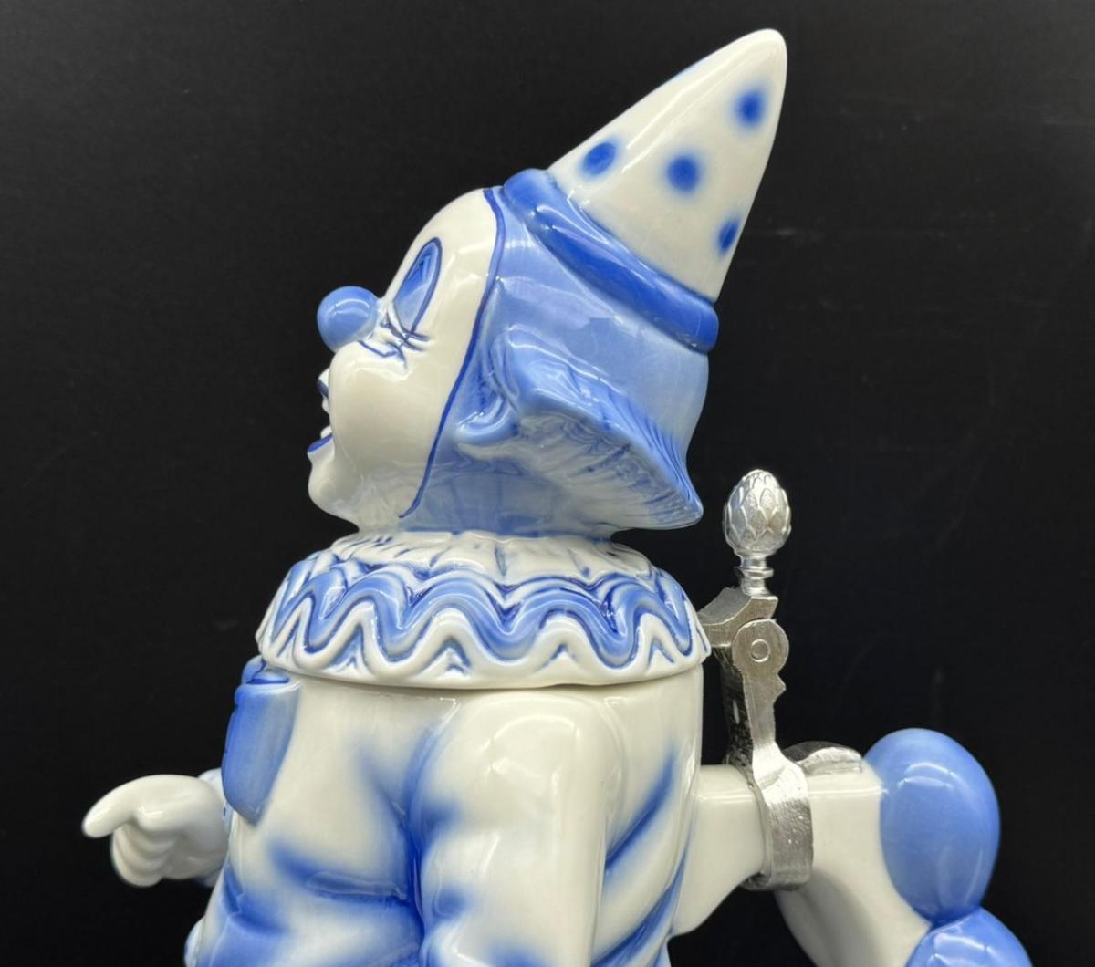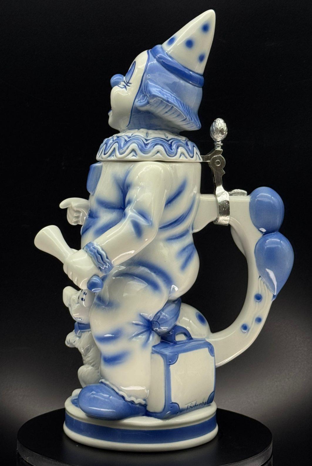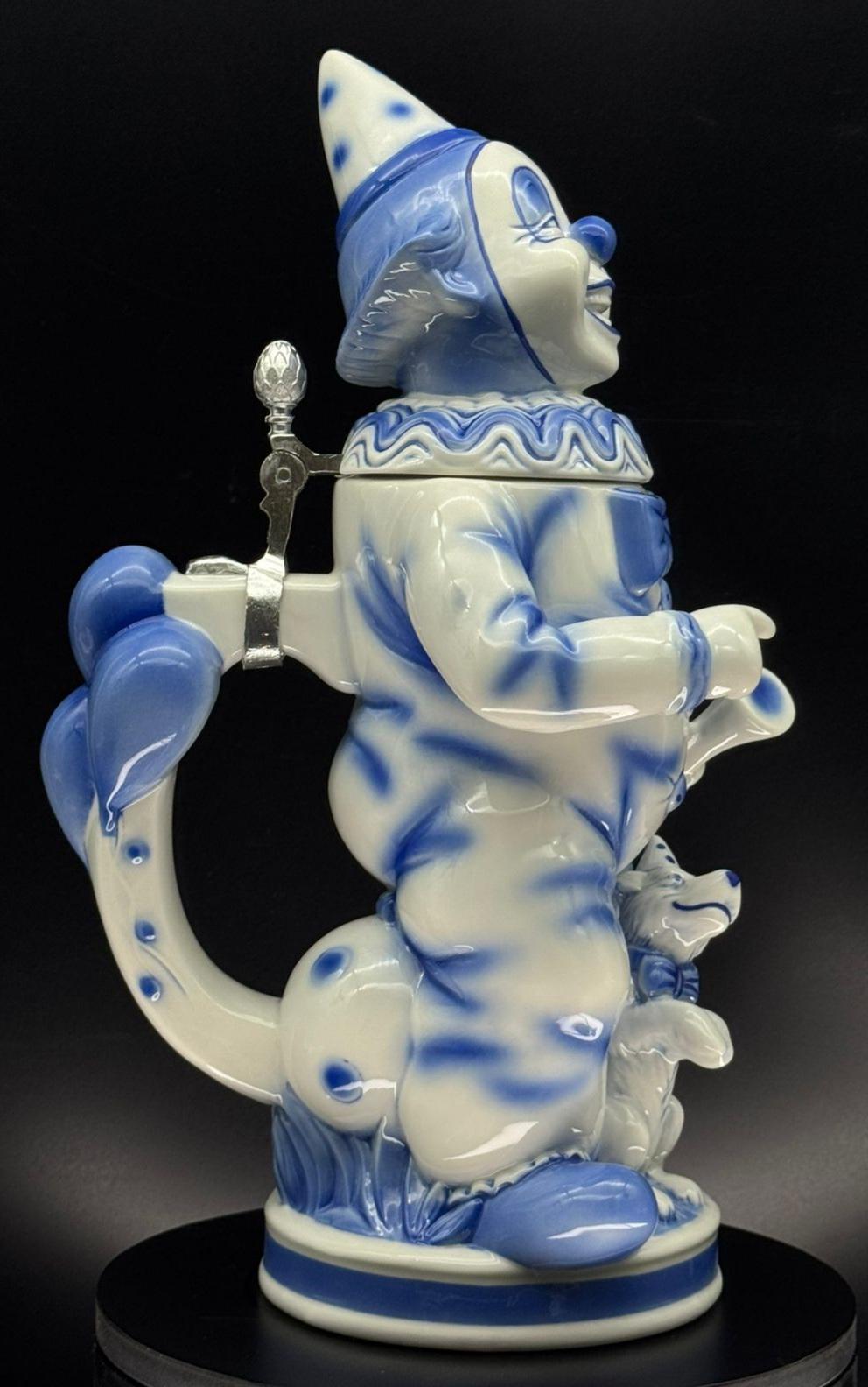 A large beer porcelain volumetric mug is made in the form of a statuette of a cheerful clown Giuseppe with his trained dog. The mug is made in blue and white tones and is part of the "Giuseppe the Happy Clown Character Stein" series, which was produced in other color solutions.