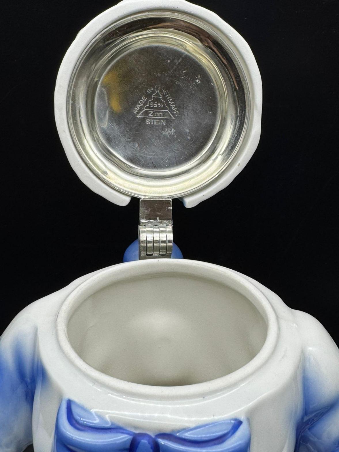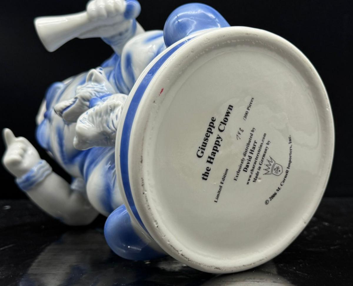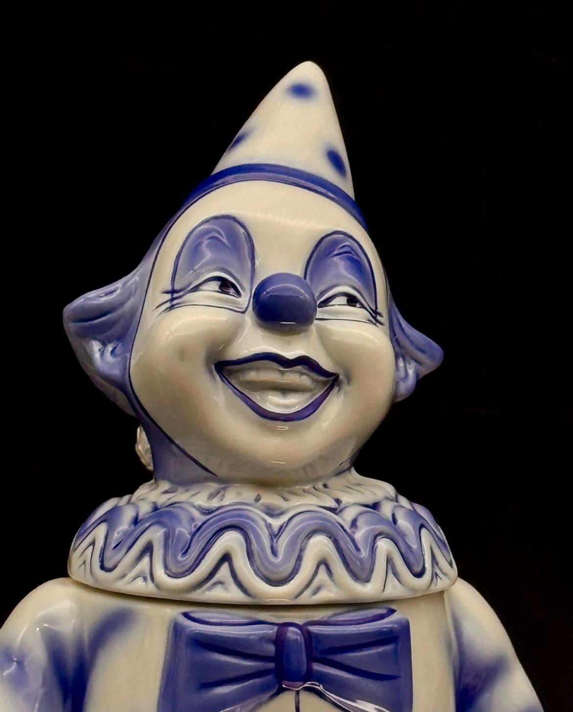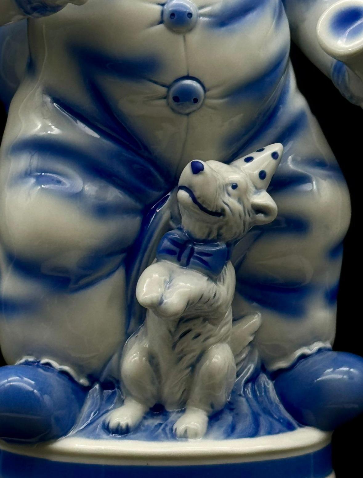 A large beer porcelain volumetric mug is made in the form of a statuette of a cheerful clown Giuseppe with his trained dog. The mug is made in blue and white tones and is part of the "Giuseppe the Happy Clown Character Stein" series, which was produced in other color solutions.