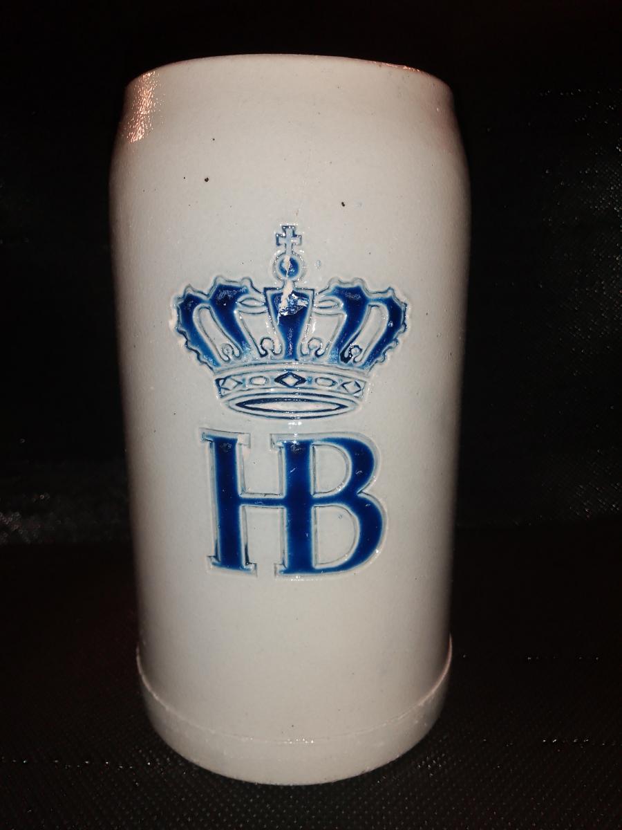 Brewery Stein salt-glazed with cobalt-blue details, incised brewery logo and crown, slightly damaged, 1l capacity mark on side, no marker's mark.