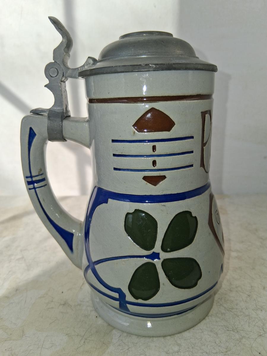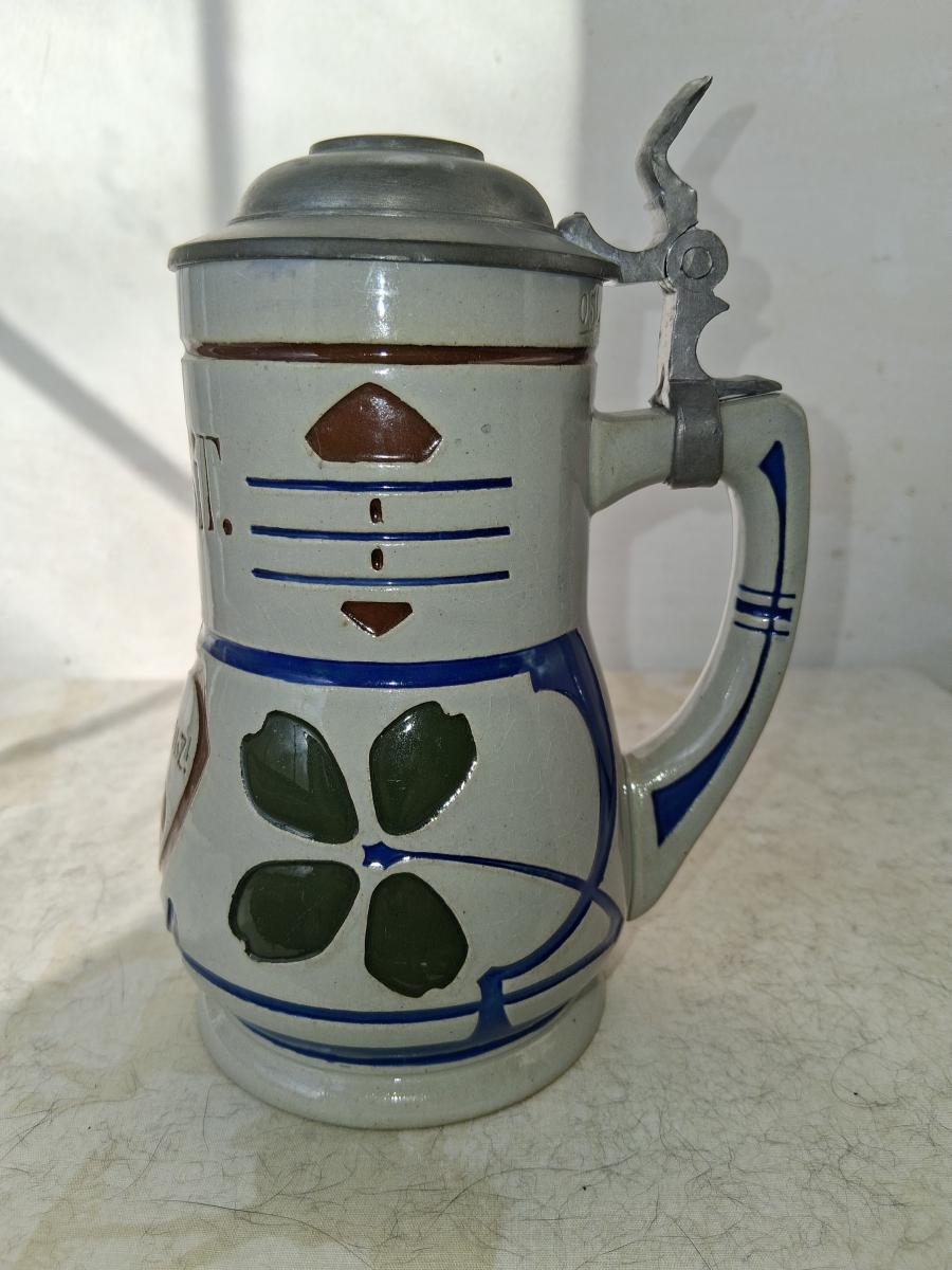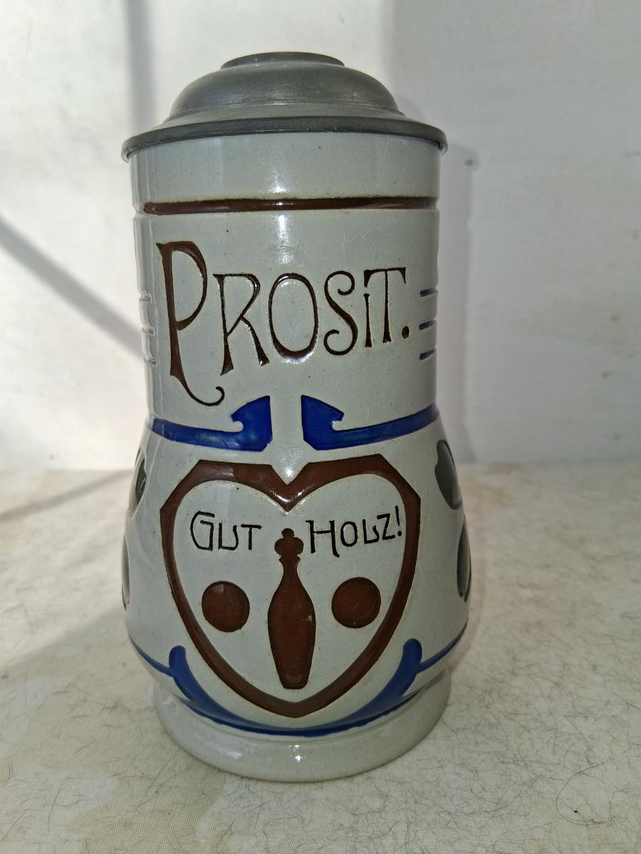 An art nouveau design featuring a salute to kegelspeil. The front has a heart vbelow Prosit, inside the heart is a kegel with a kegul on either side and the very common degeling phrase "Gut Holz" (Good Wood). Also exists with a ceramic inlaid lid featuring two crossed kegels surmounted by a kegul. Marzi and Remy mold 1772 is a very similar design but features card playing rather than kegelspeil.