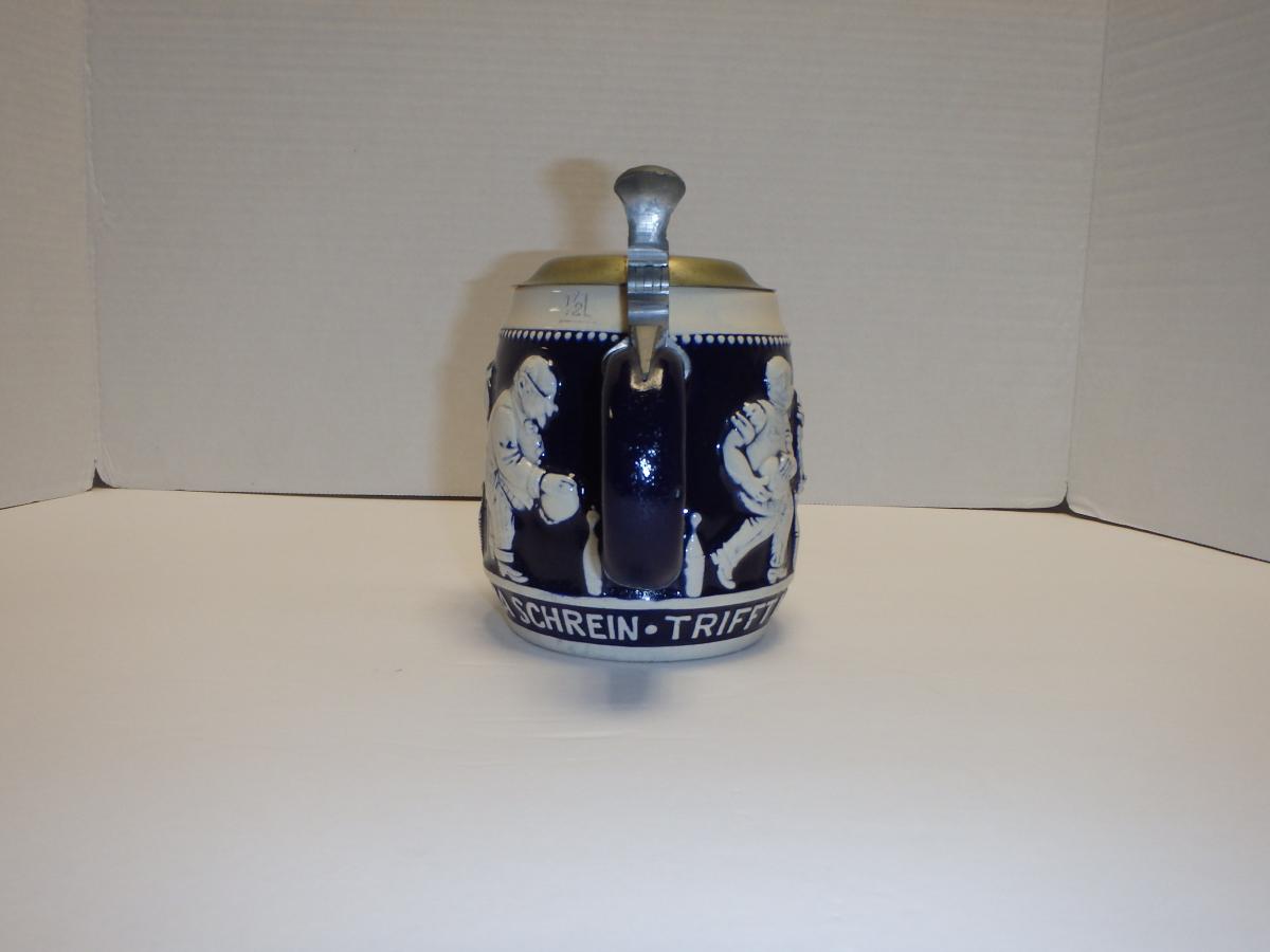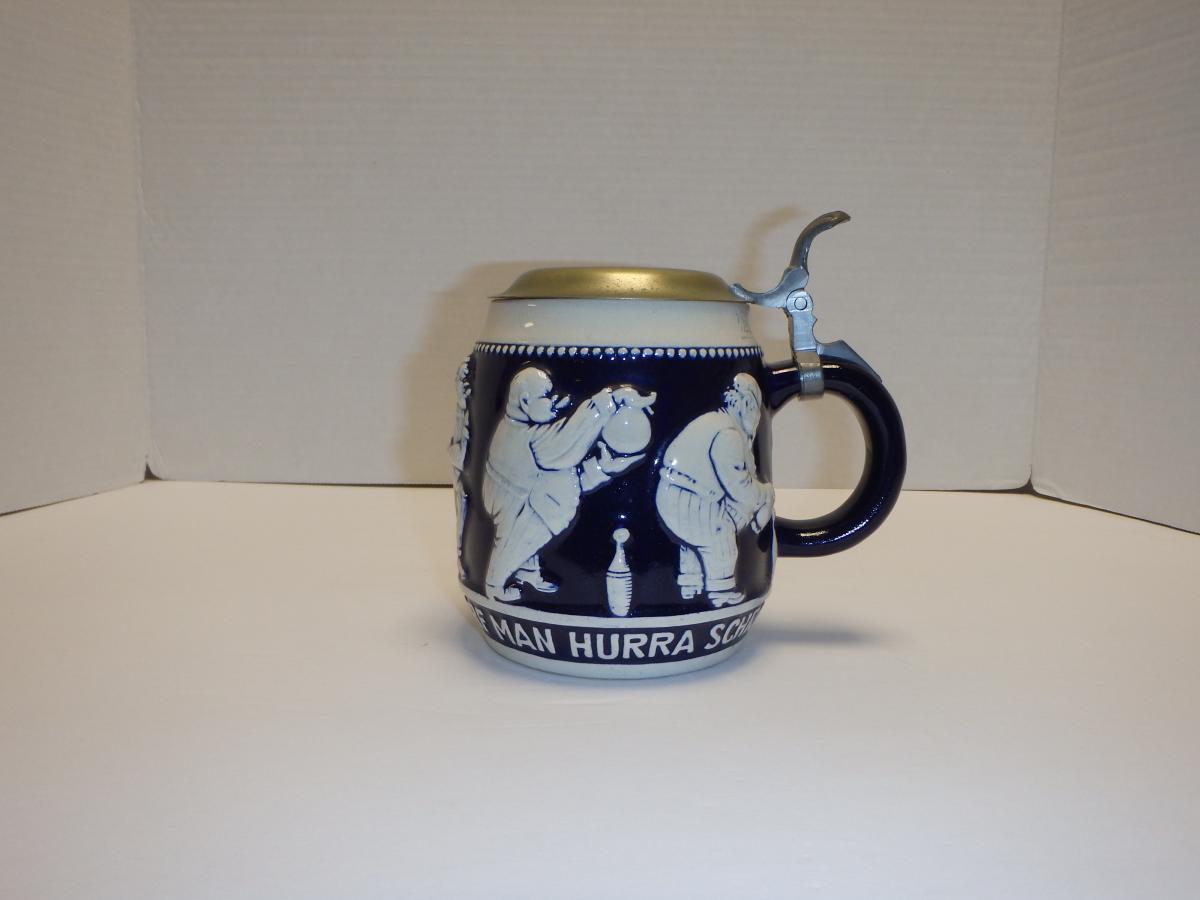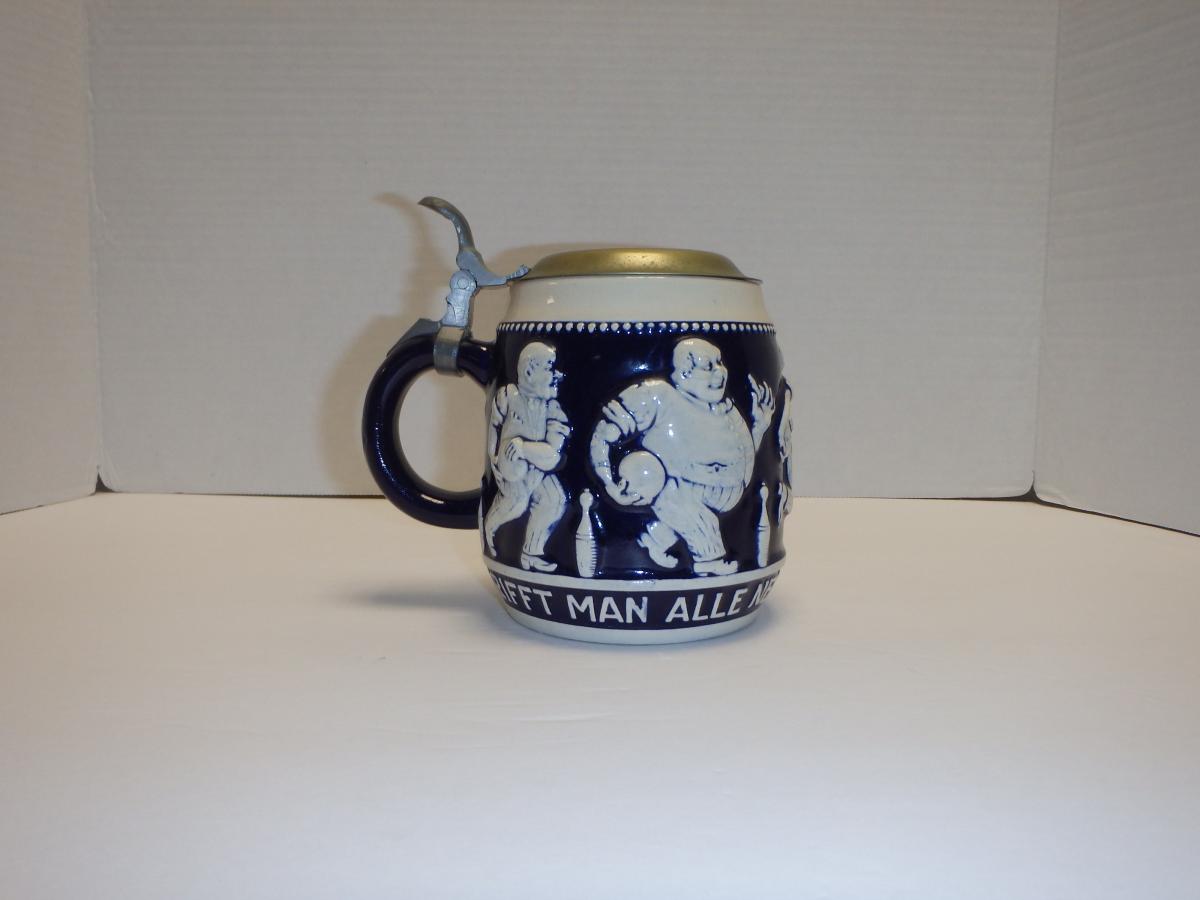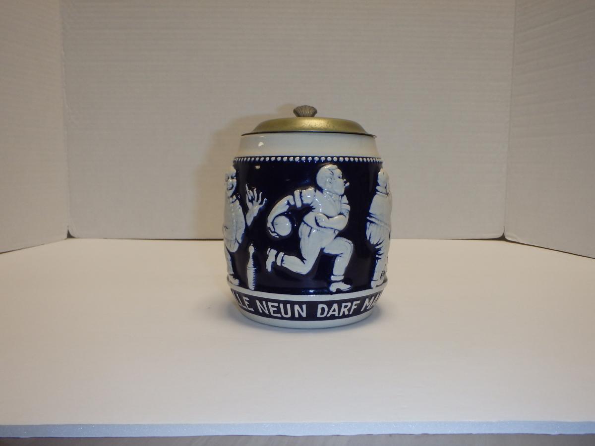 Relief decoration of men enjoying a game of kegel. Deep cobalt blue background color.