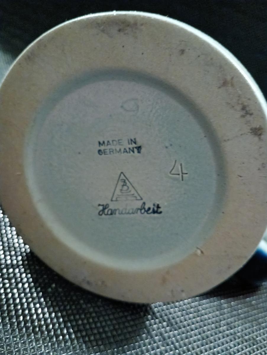 Hand-crafted Brewery Beerstein, salt-glazed stoneware with impressive, huge, bold impressed HB Logo and crown in cobalt-blue. No capacity mark, handle also in cobalt-blue Paint, in bottom stamped "Made in Germany" and "Handarbeit", "4" and Zöller and Born Logo.