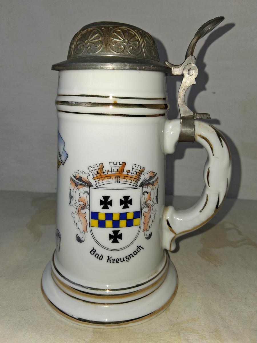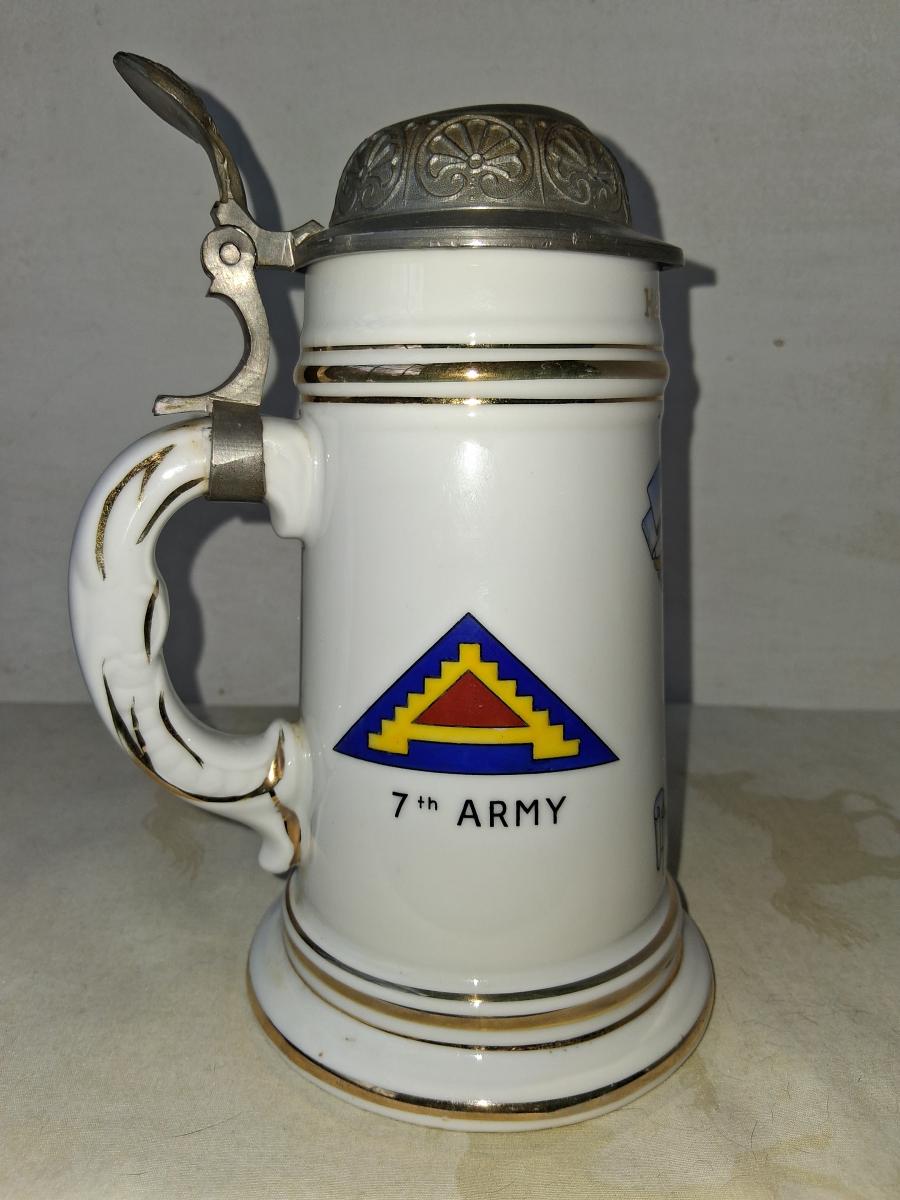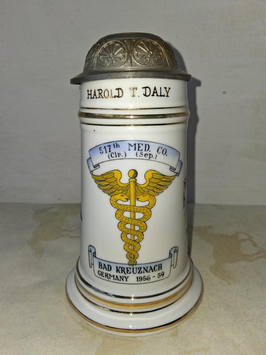 The top banner on the front is "517th Med. Co. (Cir.) (Sep)"). Below this is a medical caucus. The bottom bannner is "Bad Kreuznaach Germany 1958 - 59". At the top of the front of the stein it's named to Harold T. Daly.On the left side is the shoulder patch of the 7th Army. On the right side is the coat of arms of Bad Kreuznaach. Bad Kreuznaach is located in the Nahe River wine region. After WWII is was originally a French occupation zone but was soon transferred to the United States. The Army had a number of installations there including a Redstone missle firing range.