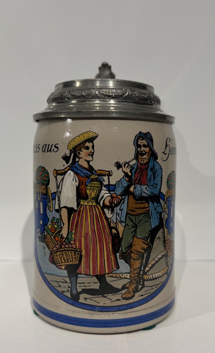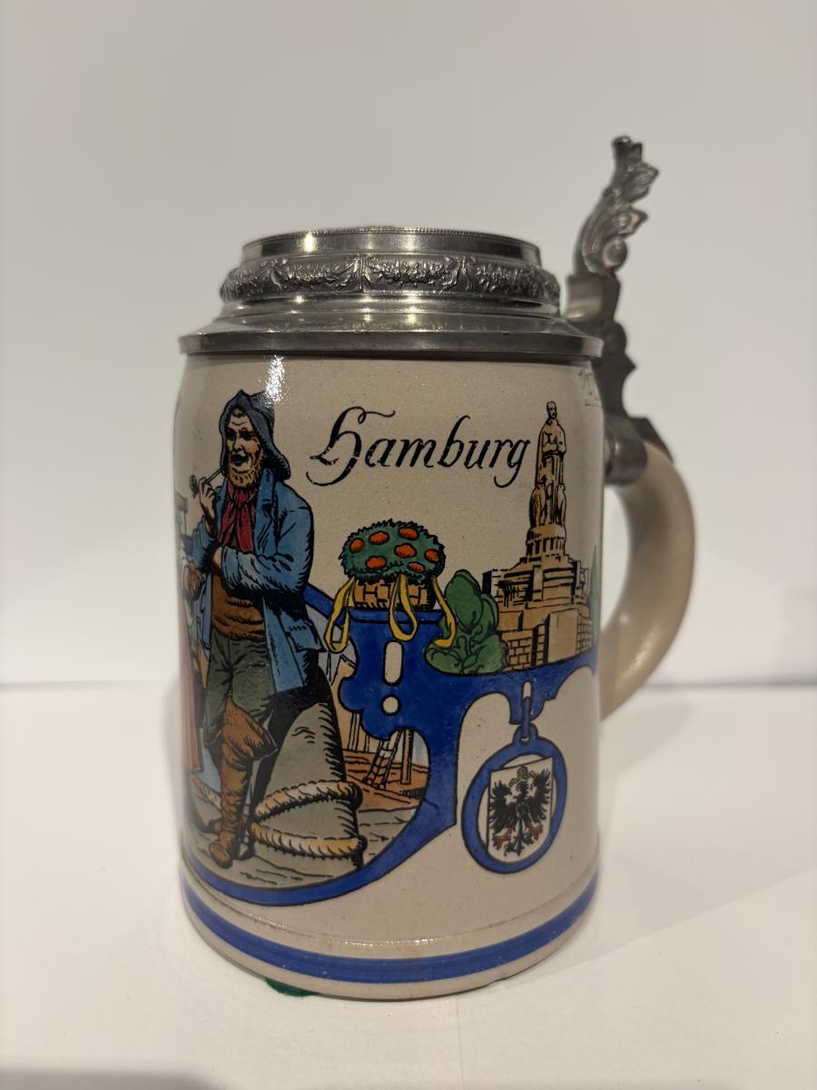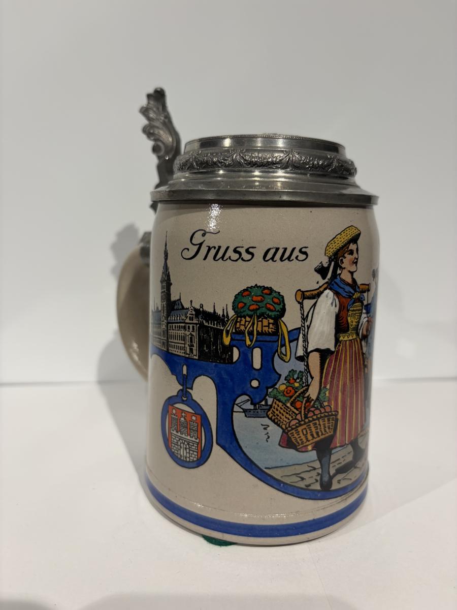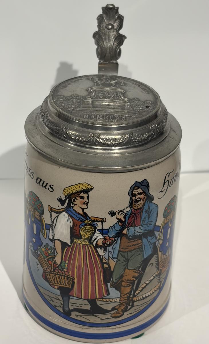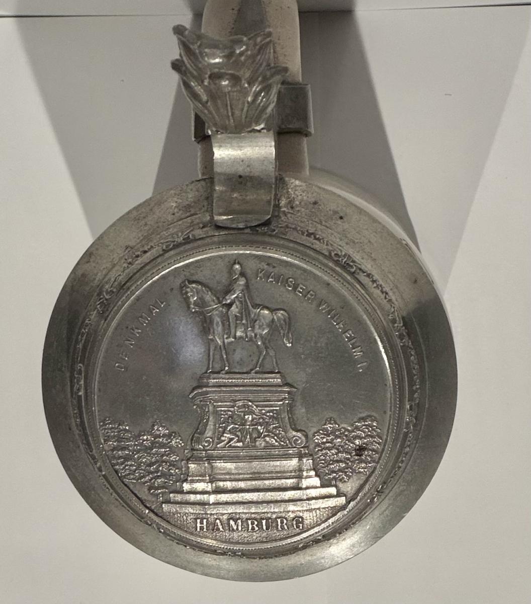 0.5 Liter with cast pewter lid of Rathausmarket square in Hamburg with the Kaiser Wilhelm memorial statue by Schilling. This was how the square looked pre WW2 as the original base of the memorial was replaced by stone in WW2 so that the metal could be repurposed for the war