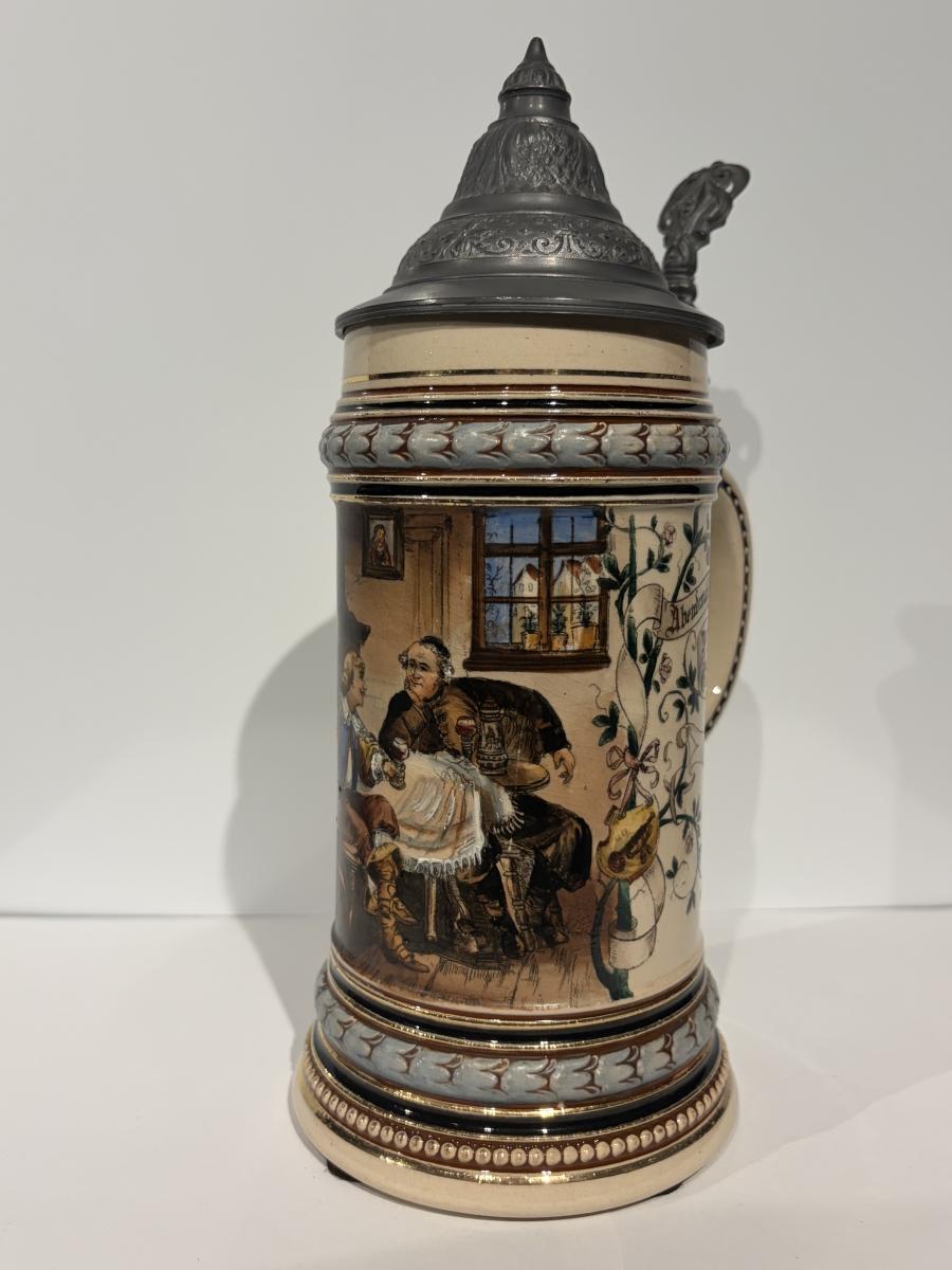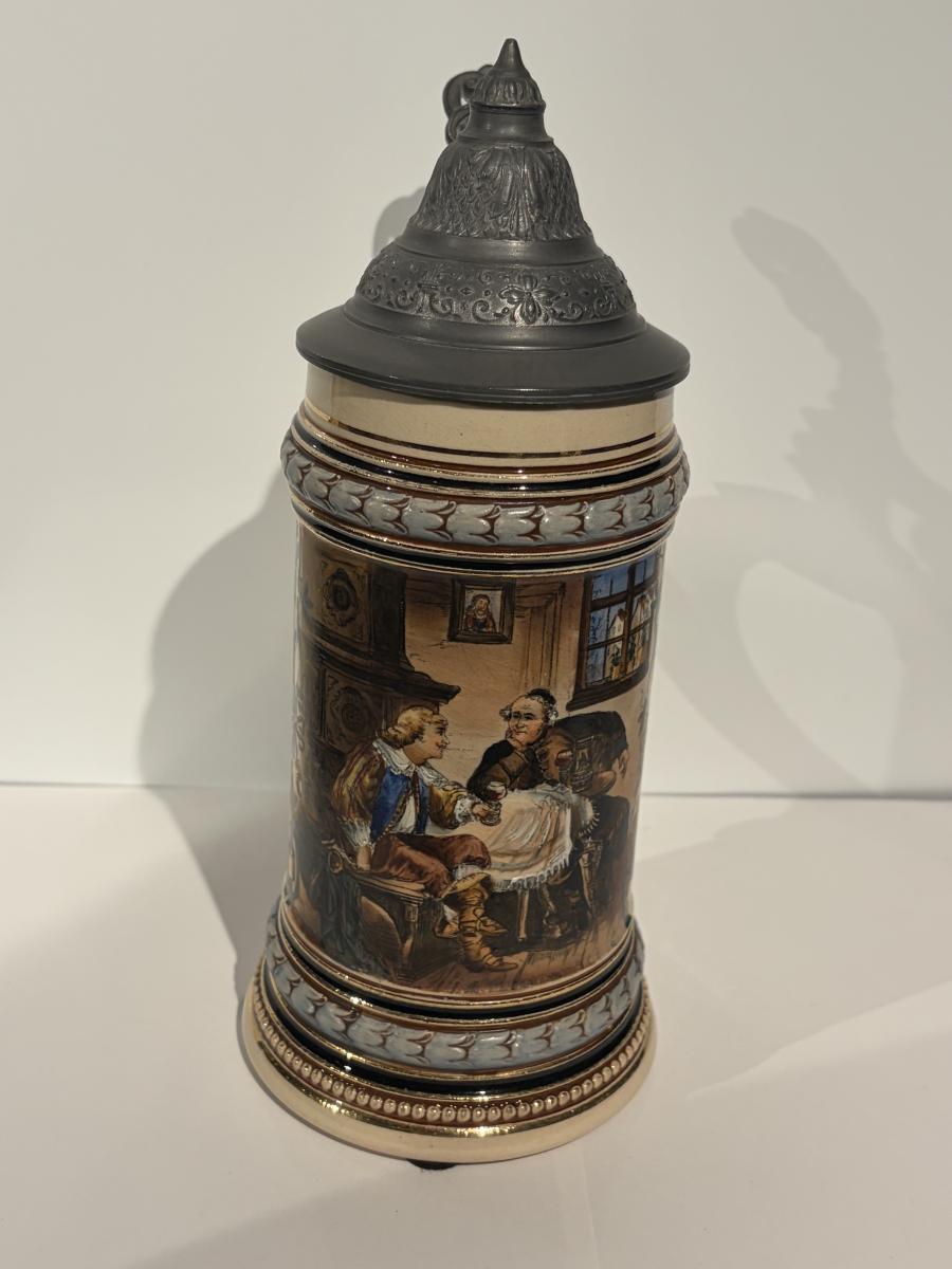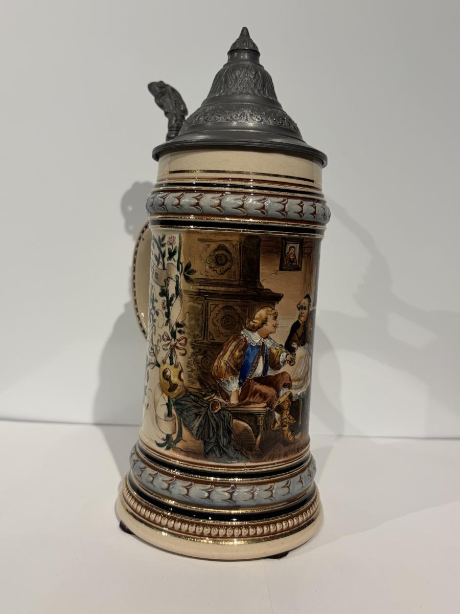 Merkelbach & Wick PUG stein Catalog # 1794 “Tavern Scene” 0.5 Liter with pewter lid 19 cm at the top of the tankard 25 cm at the top of the lid