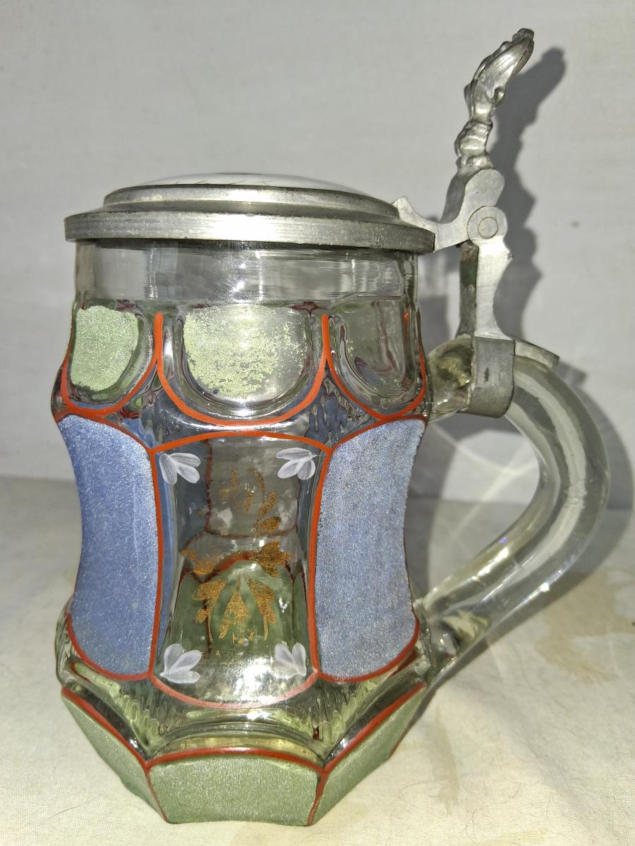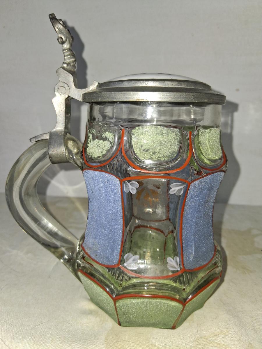 Roughened green and blue panels, hand painted floral decorations, ceramic lid lid insert, hand blown.