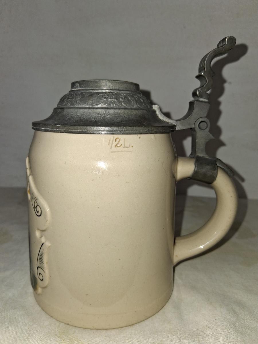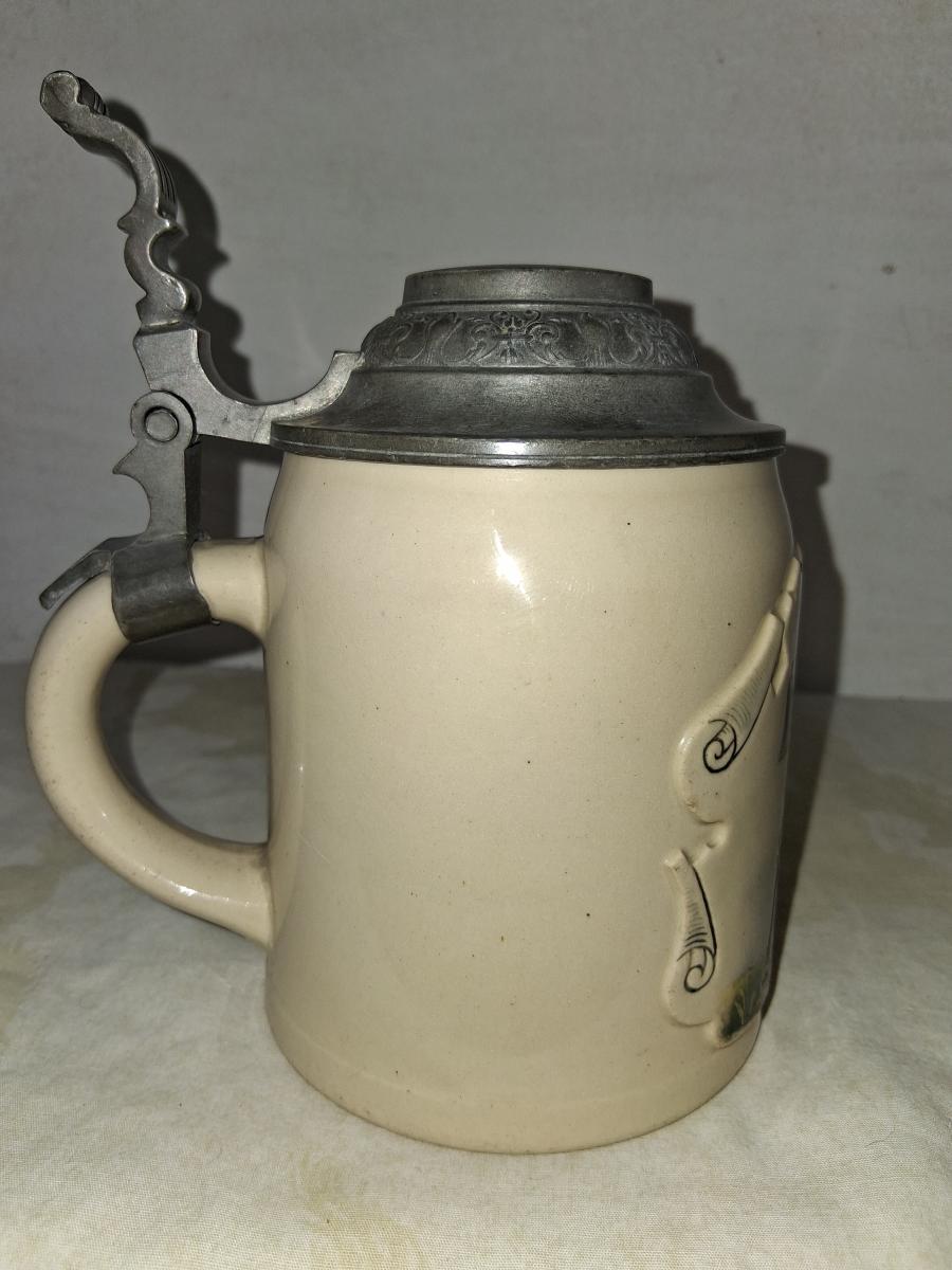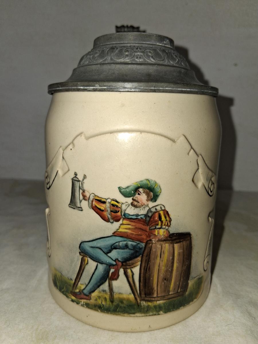 Marzi and Remy used it's much utilized 990 stein body for it's tapestry steins. The unusual thing about these Marzi and Remy tapestry steins is that sometimes they had the text on the sides and asometimes not, as here. (Should they still be called tapestry steins without the text?) I have them n both ways on some, the same etched front scene with text and without text. This one of a Landsknecht drinking is marked 990A on the base. I don't know what the A is for here, it was unusual for Marzi and Remy to use mold number extensions.