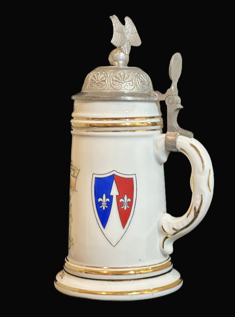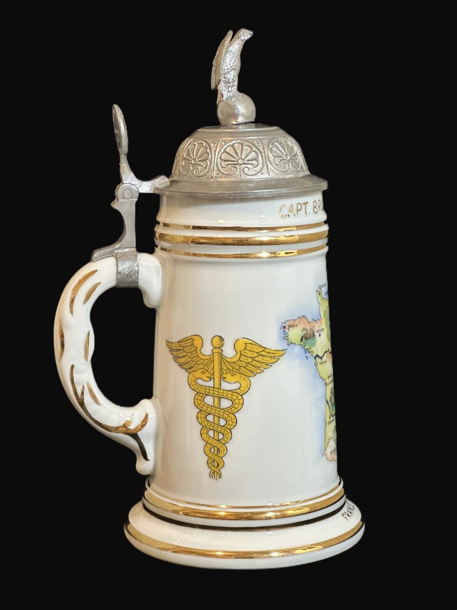 1/2 liter porcelain Cold War stein named to Cpt Bruce L. Gilmore France 1957-1959 Toul. The central scene is a map of France, the right side scene depicts a Caduceus, the Branch Insignia of the U.S. Army Medical Corp. The left side scene depicts the shoulder patch of the Theater Army Support Command, Europe (TASCOMEUR), which was established on July 15, 1951.