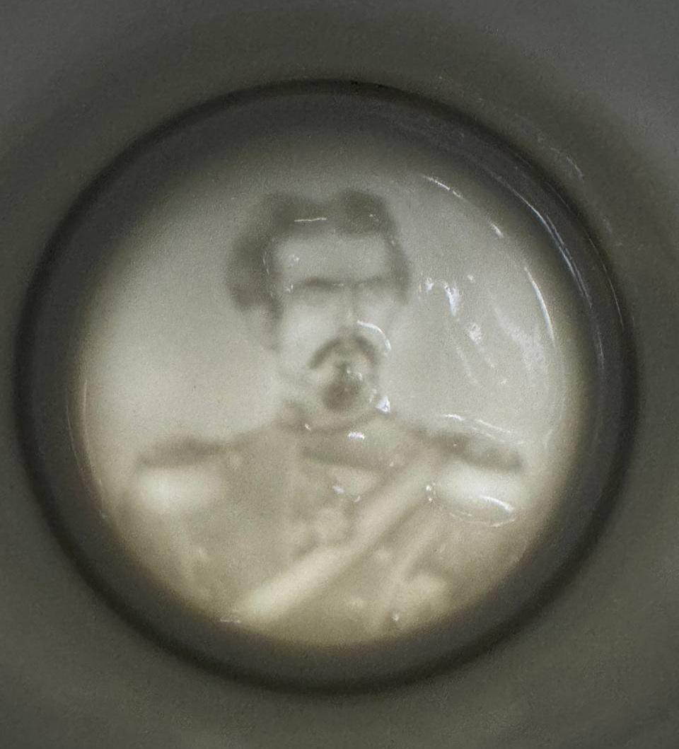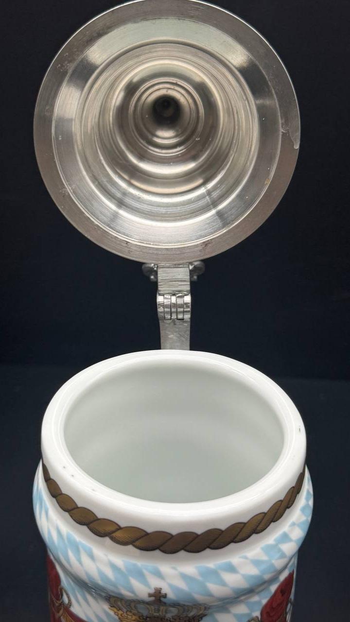 Collectible beer mug made of porcelain "King Ludwig II of Bavaria". The mug is decorated with a portrait of Ludwig II in a military uniform. The design of the mug includes a classic Bavarian pattern in the form of white and blue diamonds and an image of the royal crown above the portrait. The bottom of the cup is executed in the lithophany technique. This is the art of creating a relief pattern in fine porcelain, which becomes visible only when viewed through the light. In this case, lithophania shows a portrait of Ludwig II.