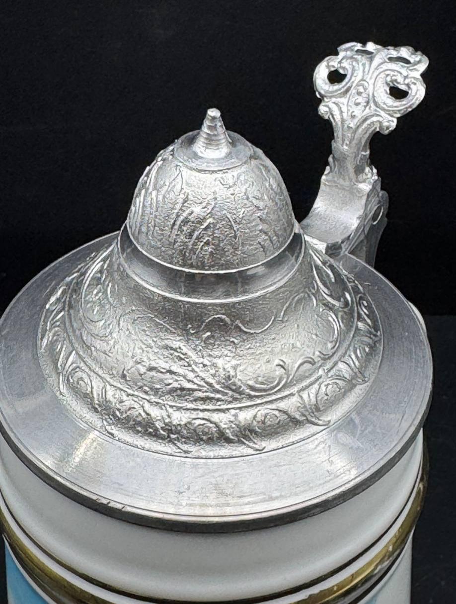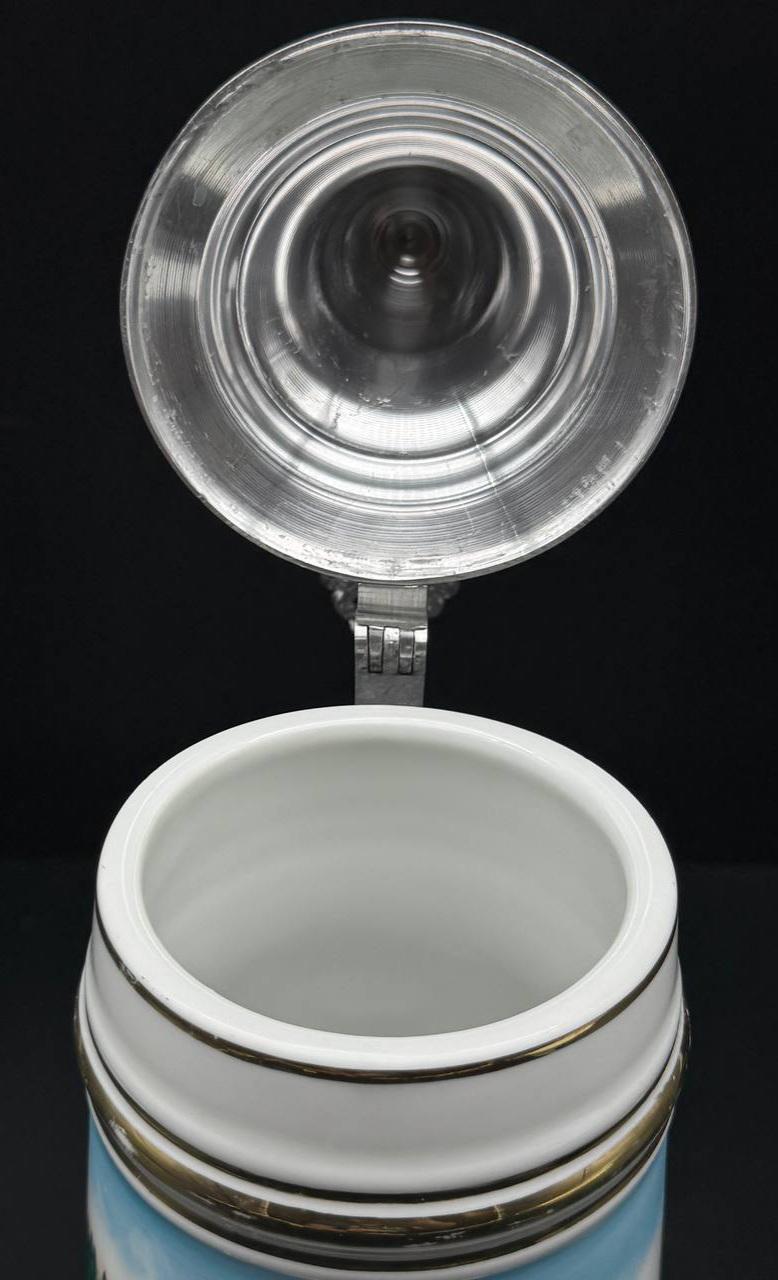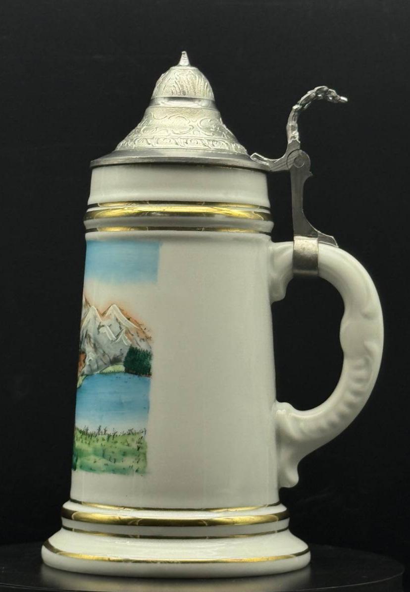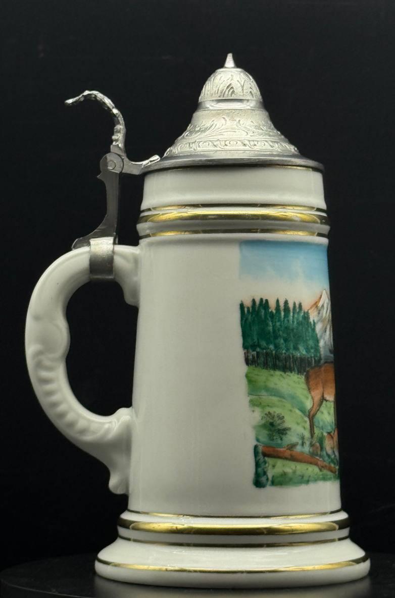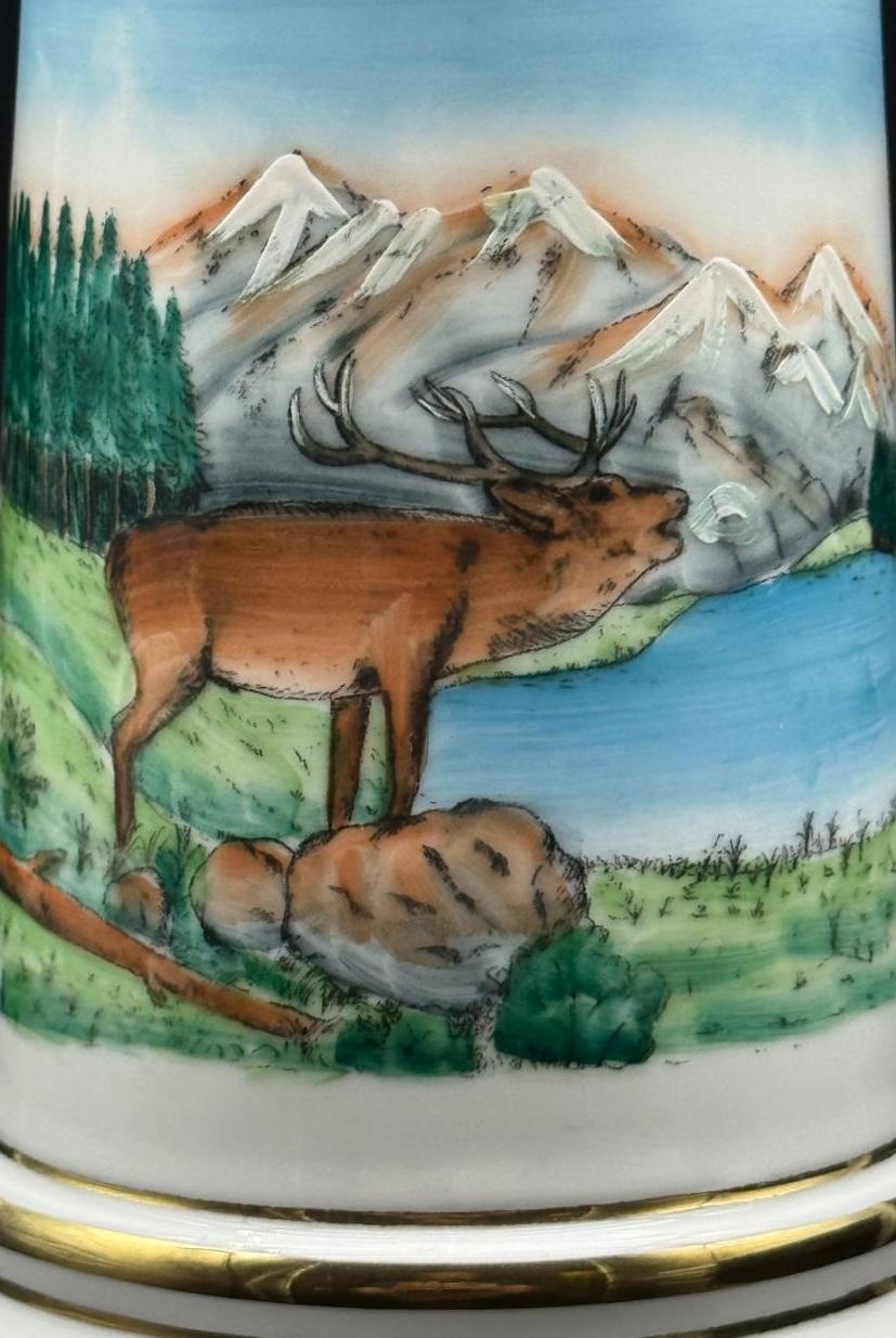 German antique hunting beer mug made of porcelain "Deer on the shore of an Alpine lake". The capacity of the mug is 0.5 liters, the height is 20 cm. The image of a deer on German beer mugs symbolizes noble prey and hunting traditions.