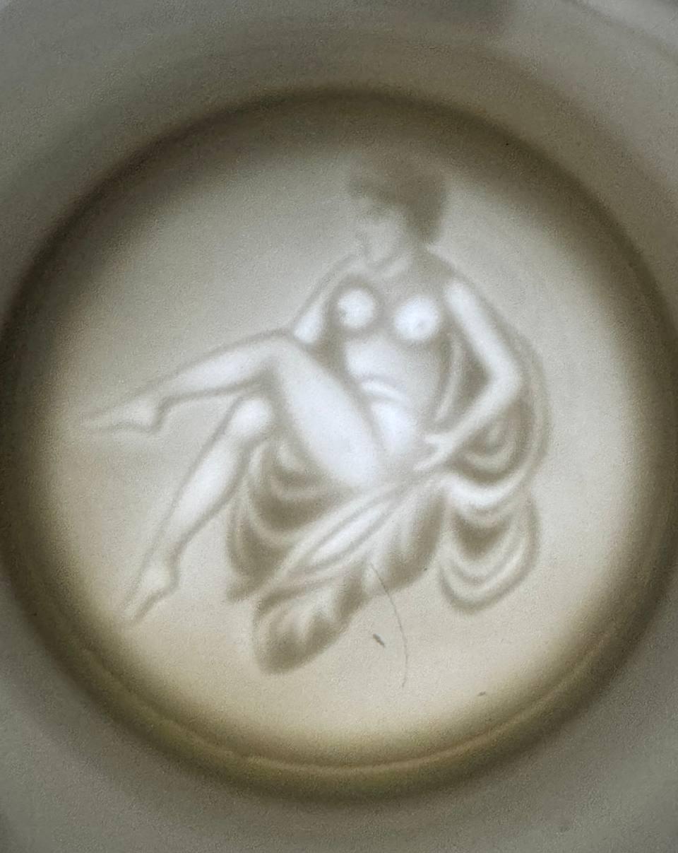 Lithophany is the art of creating translucent images, where the picture appears only when illuminated from behind. The technique is based on different thicknesses of porcelain. Thin areas look lighter, thick areas look darker. In this case, when viewing the bottom of the mug in the light, you can observe a drawing with an erotic plot. Thus, the artistic design of the mug creates a complete picture.