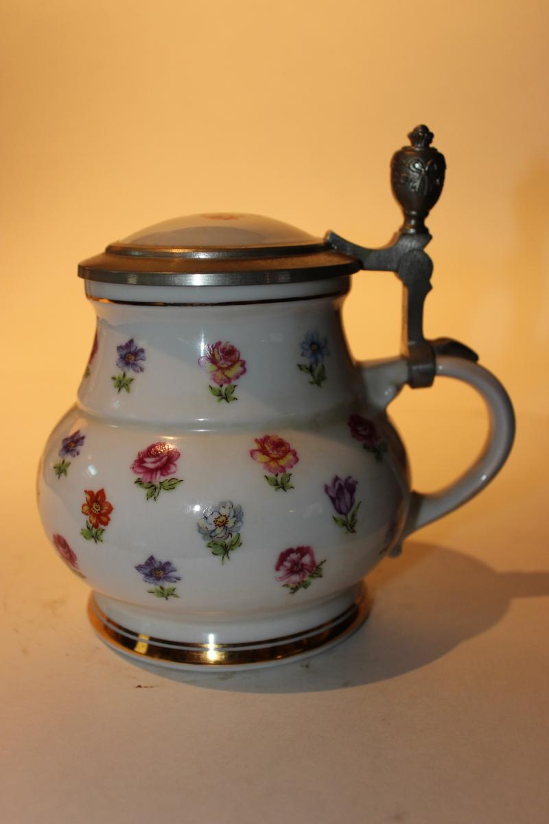 1/2 Liter Porcelain stein with inset lid flower decoration body and inset well marked base