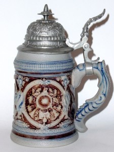 ~~~~~~~ There have been two "digs" in Freising, of dumps (waster-heaps) specifically associated with the stoneware factory established there in 1876; one in 1988, and the other in 1990. Shards recovered from those excavated dumps provided material for two articles in Amperland magazine, a magazine dedicated to archeological discoveries in the Freising, Dachau, and Fürstenfeldbruck area. And, in a book by Herbert Hagn titled "Potters of Old Bavaria, Ceramic Finds, from the 15th Through the 19th Centuries," the last chapter is dedicated to the Freising factory and its products. This book provides additional material to that in the magazines and all three provide examples of shards from the two digs. It is generally accepted that there is a 99% plus probability that shards recovered from wasting-heaps located on property where there was a kiln in operation are products of that kiln. The 1988 dig produced shards of "altdeutche" (old German) style stoneware along with more contemporary pieces. While some of these shards appeared to have HR attributes, none of them carried the HR logo, all were stoneware, and all appeared to be unique to Freising in that they could not be attributed to any other known factory. In the 1990 dig they found a number of shards with the HR logo and pieces in stoneware, ivory stoneware, and porcelain that were recognizable as HR pieces. Some were similar in appearance to known Westerwald products. If I could match a shard from the 1988 dig to a known stein and find a characteristic, or characteristics, that carried through to steins marked HR, then I could probably feel safe in assuming that HR actually manufactured steins in Freising. When I say the steins were manufactured in Freising I mean the clay was prepared, pressed into the molds, removed from the molds, dried, cleaned, decorated, and finally, fired in the Freising factory. Manufactured means manufactured, not decorated and lidded using blanks purchased from another factory. This is not to say however that that did not occur later on. As luck would have it several of the illustrated shards matched steins I was familiar with. Without those shards to connect the steins to Freising the steins might as well have been from the Moon. I give you several examples.