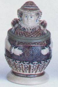 Model 57 The Alpine Lady, or Kellerein, is from the 1876-1878 Schön-Hauber period and is one of several early character steins for which shards were uncovered in 1988. This piece has a decorator initial.