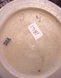 Model 208 - The stoneware shard on the left is from the same Freising dump as the previous piece and is a small section of a blue and grey jug. The picture in the center shows the same section from the jug on the right, a Freising model number 208 that has both QC and Decorator marks. ~~~~~~~