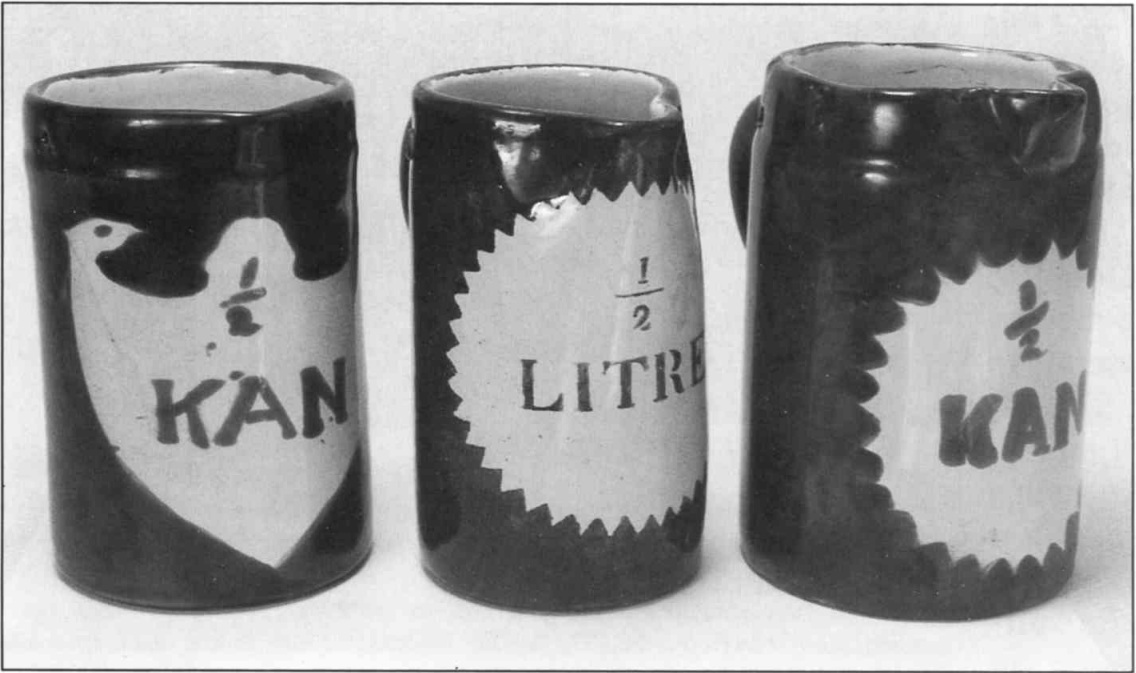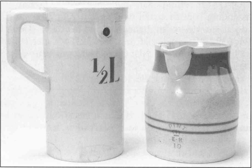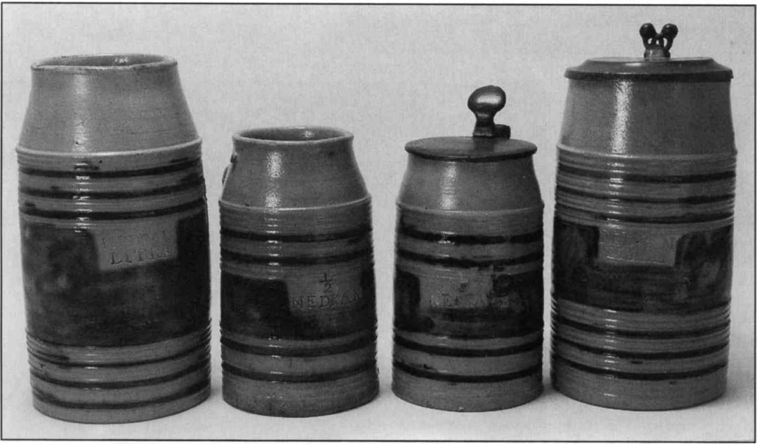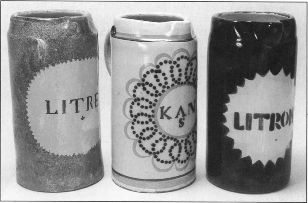 Nog in het begin van de vorige eeuw dronk men bij de maaltijd geen water maar bier (met een veel lager alcoholpercentage dan tegenwoordig); de beter gesitueerden dronken wijn. Met de kwaliteit van het water was het in die tijd namelijk niet altijd goed gesteld; waterleiding bestond nog niet algemeen. De tappers en herbergiers moesten vanaf april 1830 metrieke inhoudsmaten gebruiken. Omdat tinnen maten duurder waren dan die van steengoed, was de keuze niet moeilijk. Al in de voormetrieke periode waren er stenen kannen en drinkpullen in gebruik, met dezelfde vormgeving als de nieuwe stenen inhoudsmaten (afb. 2). Of zou hun vormgeving zijn gebaseerd op de Franse tinnen maten zonder stortrand?