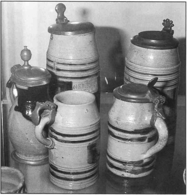 Afb. 7 Collectie Stenen kannen en voormetrieke maten, sommige met tinnen deksels.
