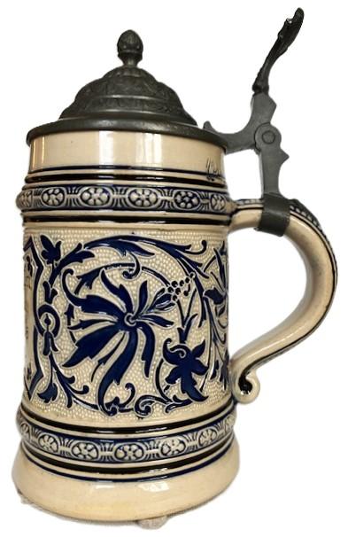 Hauber & Reuther lost their clay supply for stoneware in 1886. So, they started making steins out of porcelain. But in 1888 they contacted Merkelbach & Wick to make ivory stoneware steins for them. It's thought they bought stein bodies only and painted or repainted parts of the stein and refired them. Then added lids and sold them as H&R products. The HR logo on the base is close to a real HR logo but different and unique to M&W made steins. The capacity mark is a common M&W 1/2L capacity mark.