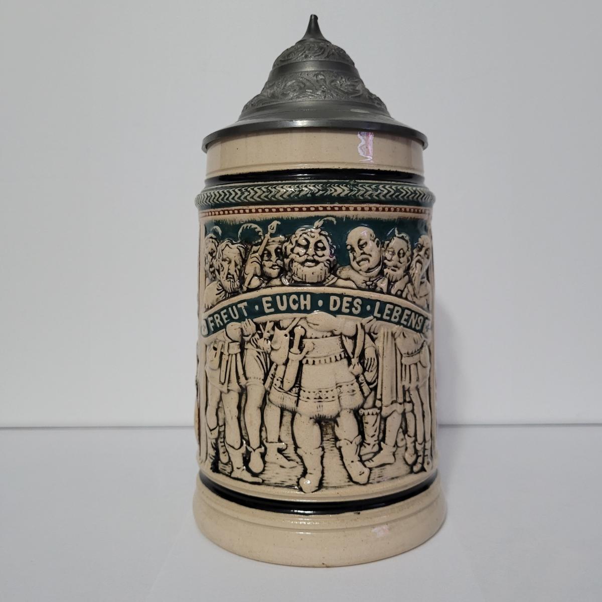 This stein has the original images. After WW1 the central choral society image was replaced by harp and swan. The text in the center image translates to "enjoy life". The text on table in the side panel translates to "Long live singing"