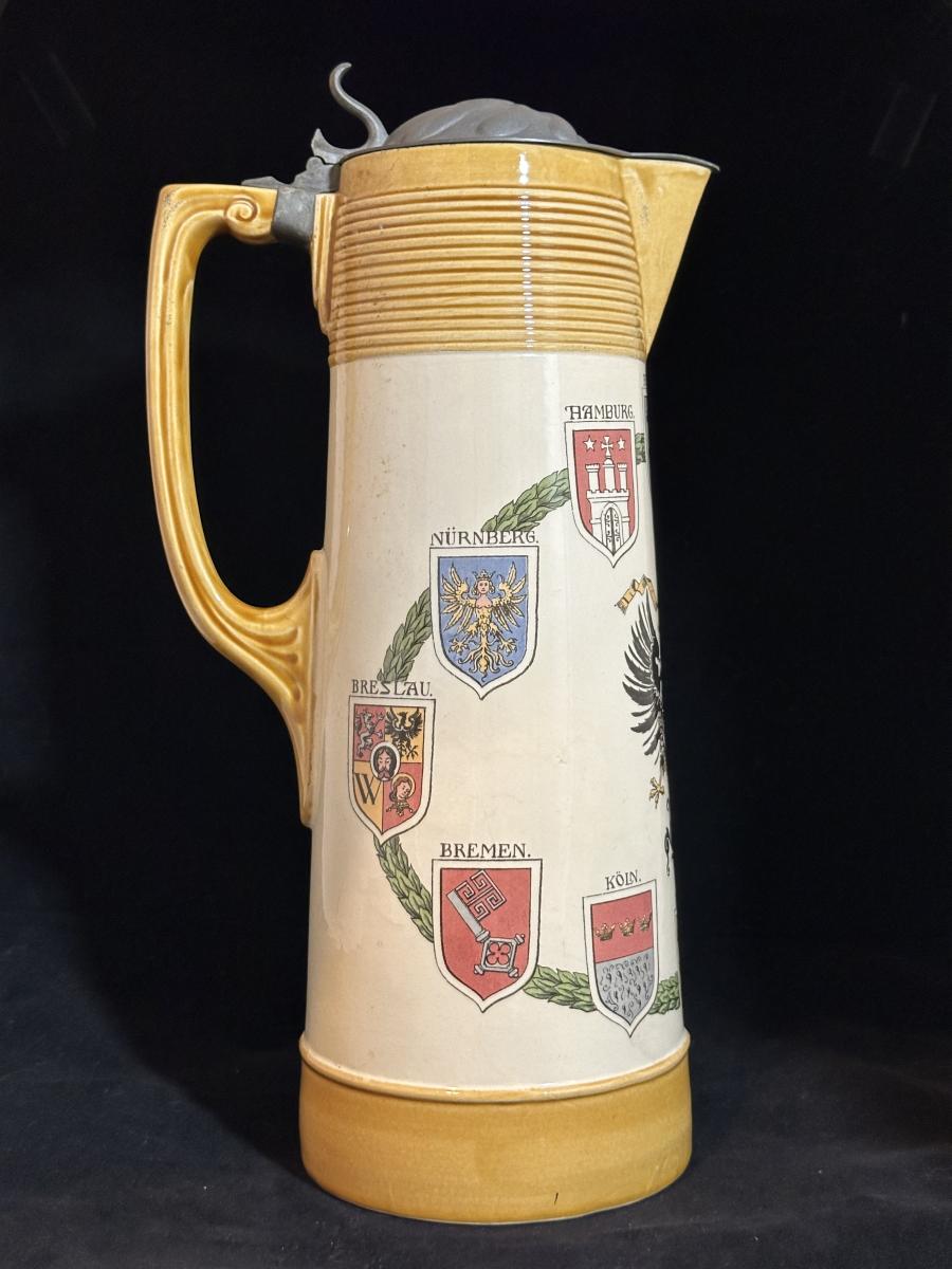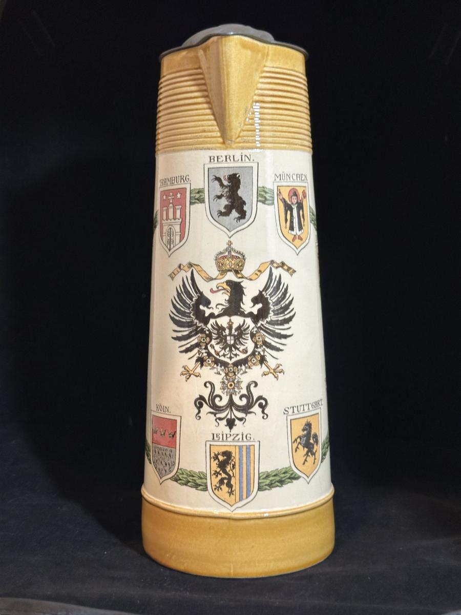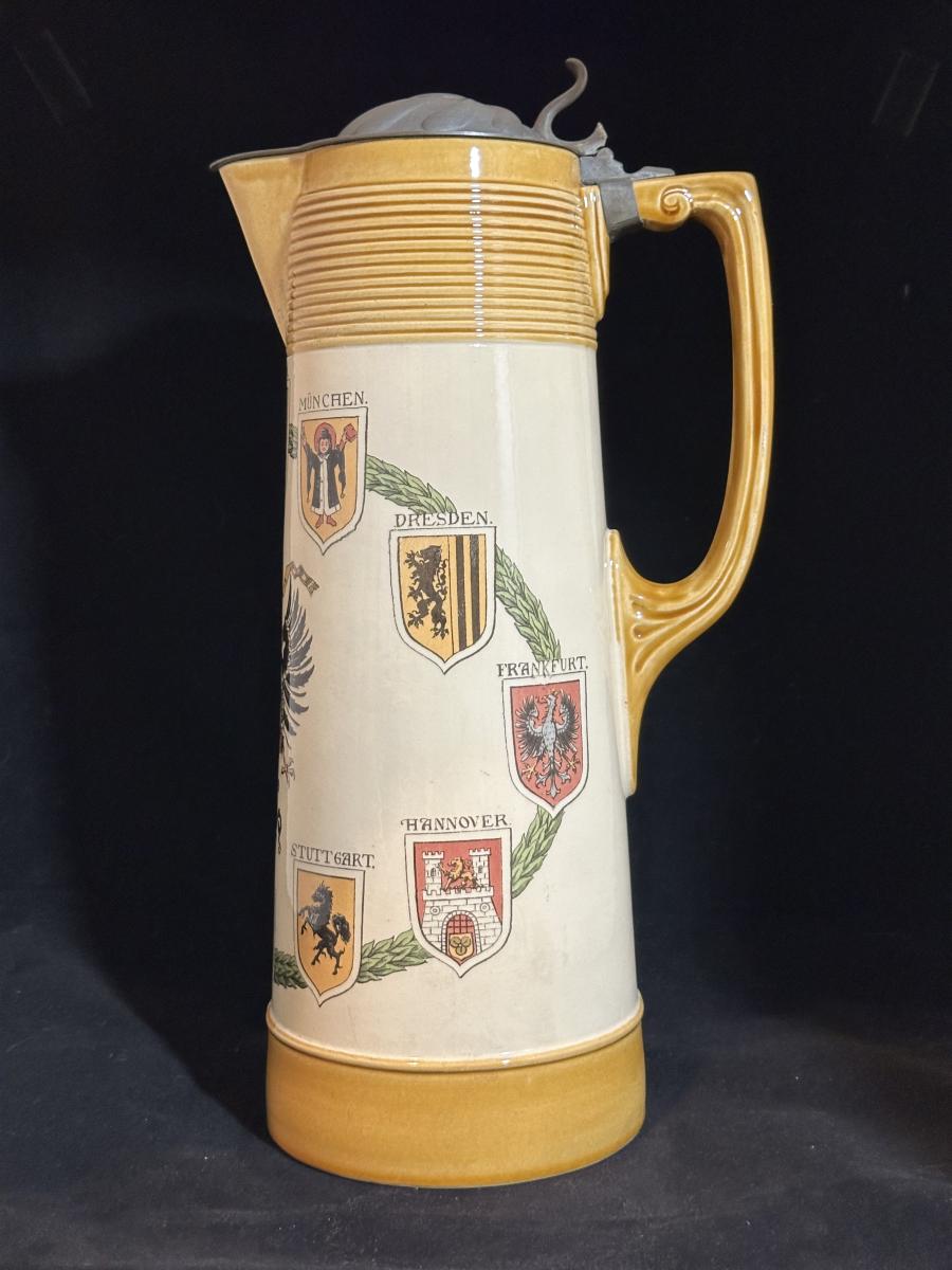 Mettlach 2893/1200, 3.25 Liter pouring stein with pewter lid and the city coats of arms of Berlin, München, Dresden, Frankfurt, Hanover, Stuttgart, Leipzig, Köln, Bremen, Breslau, Nürnberg, & Hamburg.