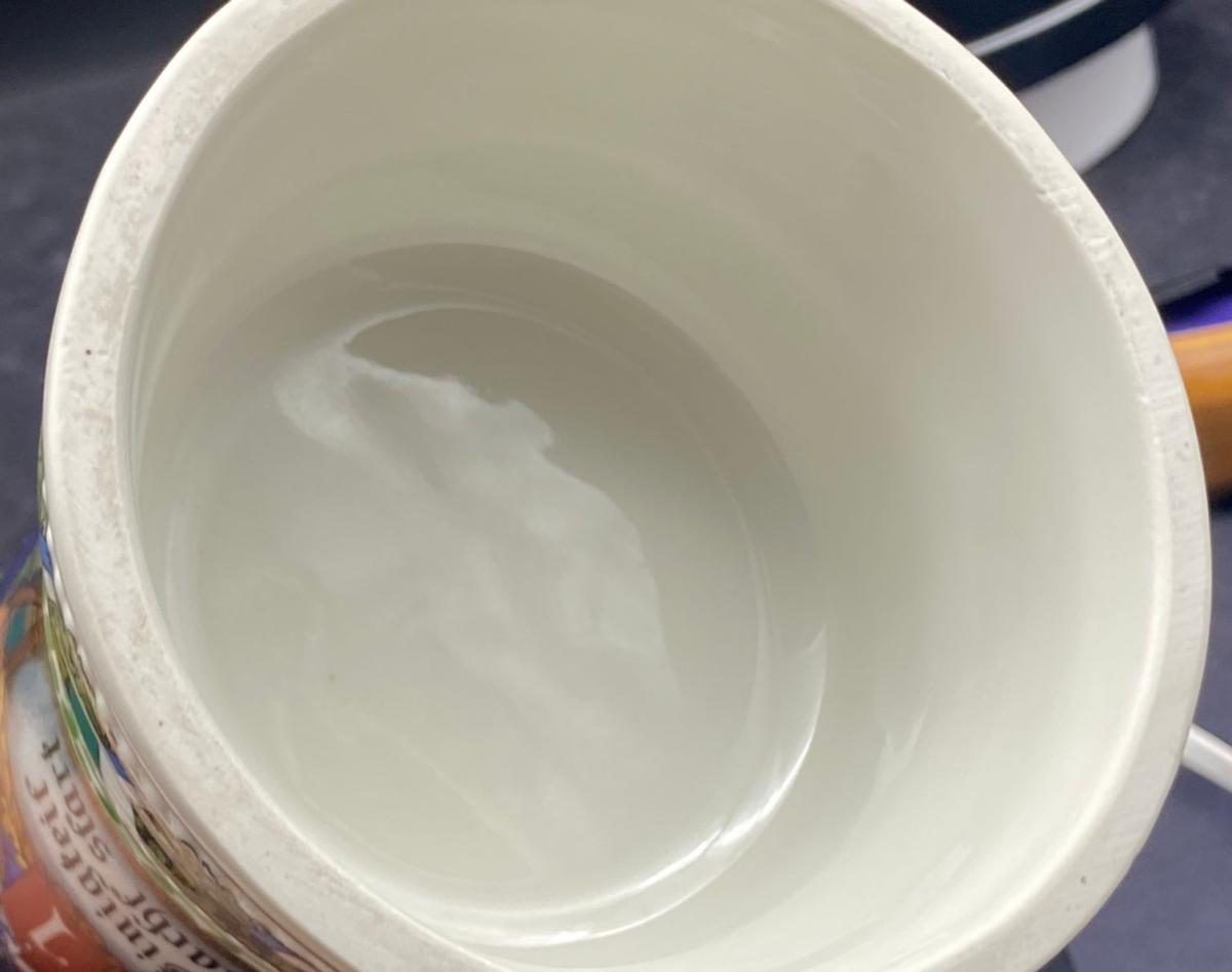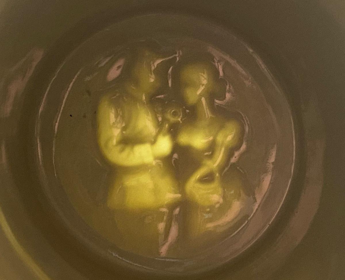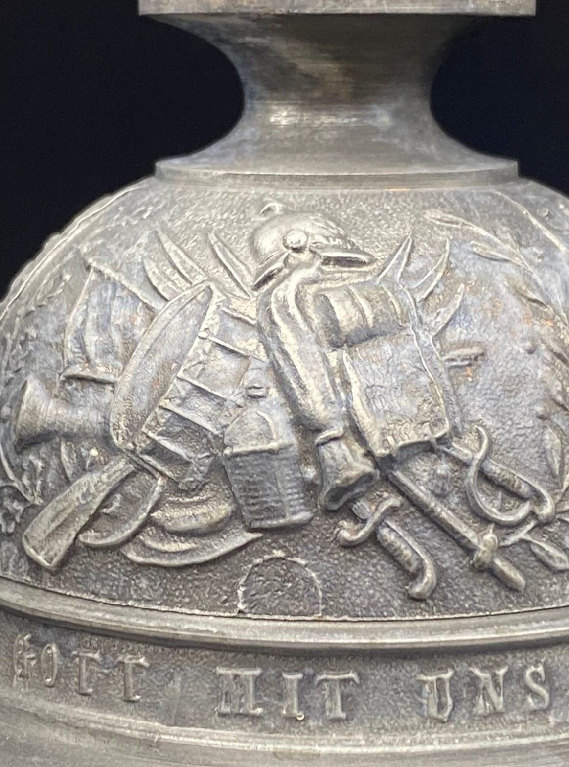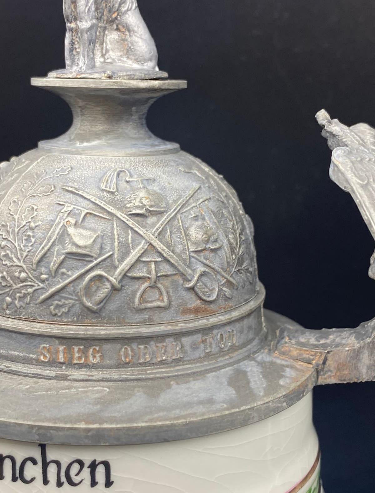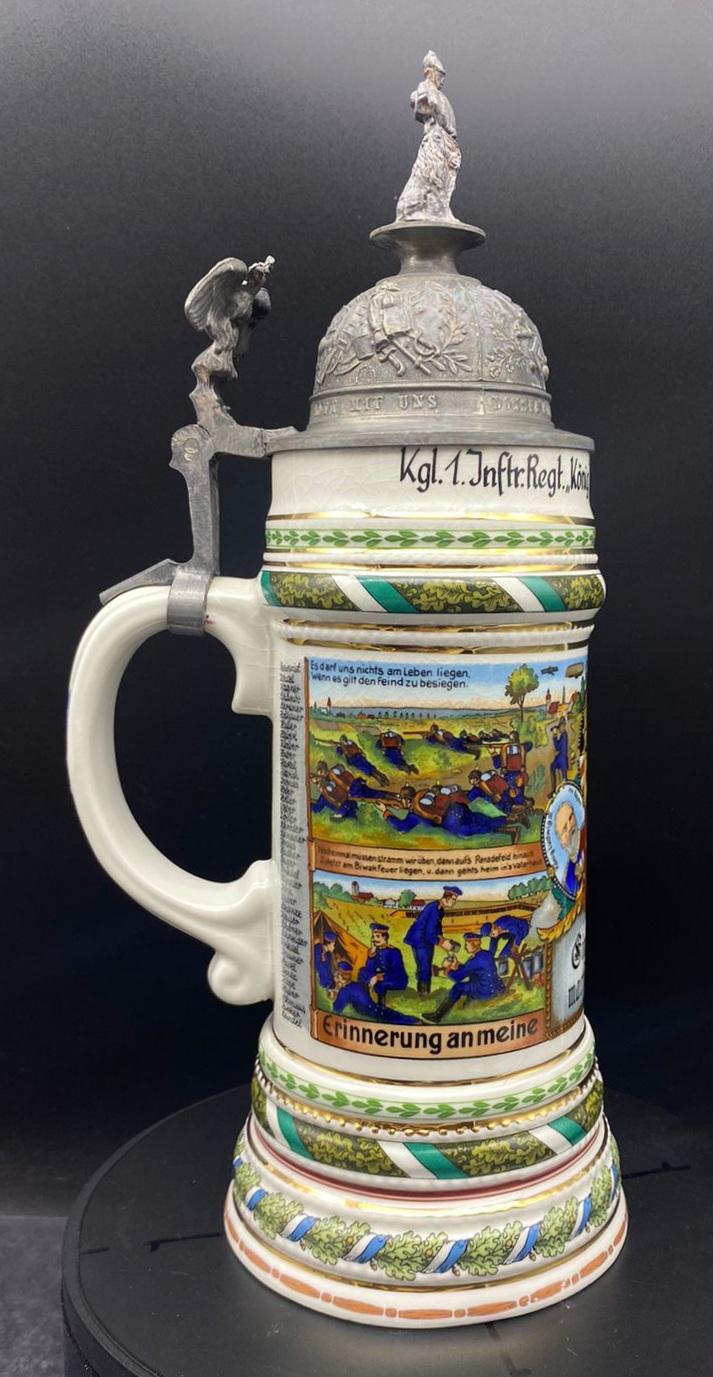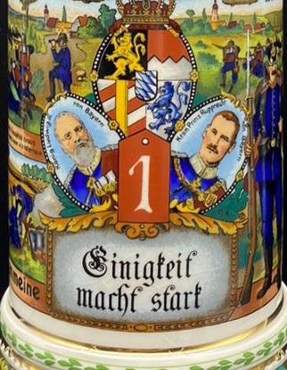 In the center of the front of the mug is the coat of arms of the Kingdom of Bavaria. Just below the coat of arms, we see two portraits. On the left is King Ludwig III of Bavaria. On the right is his eldest son, Crown Prince Ruprecht. In between is the chevron of the 1st Royal Infantry Regiment. The bottom of the composition is completed by the regiment's motto, "Einigkeit macht stark." Translated from German, this means "Unity makes you strong".