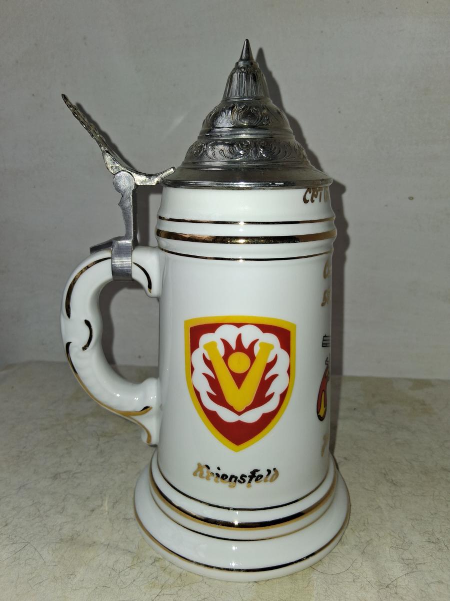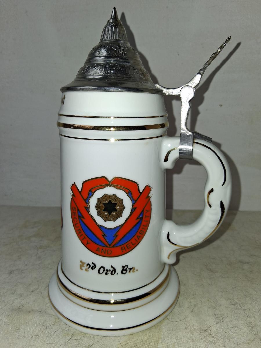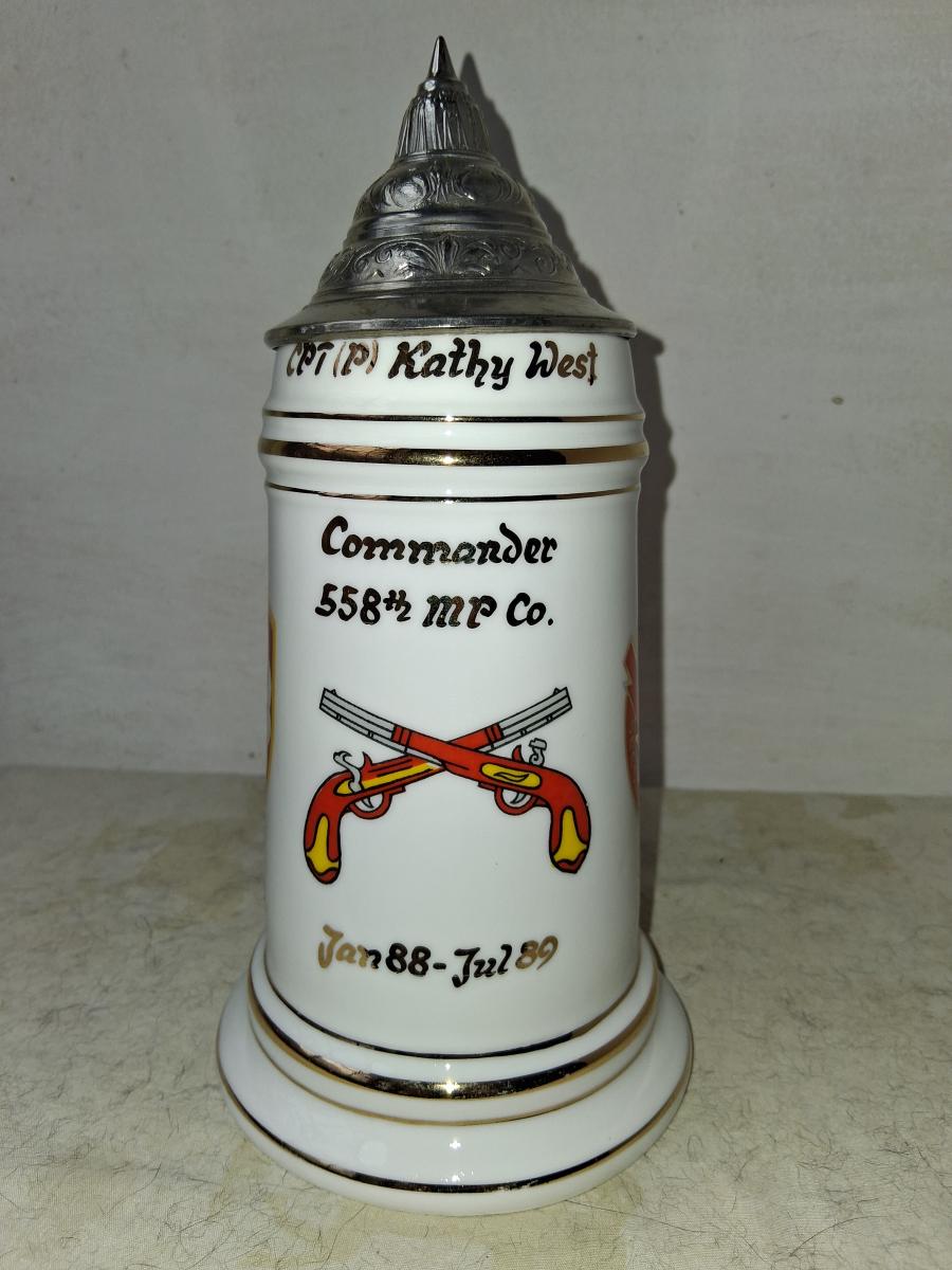 At the front top of dthe stein it is named to Cpt (P) Dathy West. Below that is "Commander, 558th MP Co.". Below that are the standard crossed pistols of the Military Police. At bottom front it's dated Jun 88 - Jul 89. On the left side is an insignia and below that Kreigsfeld. I have no idea what the insignia is, it's not Kriegsfeld's coat of arms. Kriegsfeld is a muninipality in the Donnersbergkreis district which is in the middle of Reinland-Palatinate, Germany. On the right side is :558th Ord Ban." with it's insignia. It's a little unusual to find a woman as Commander of an MP Company.
