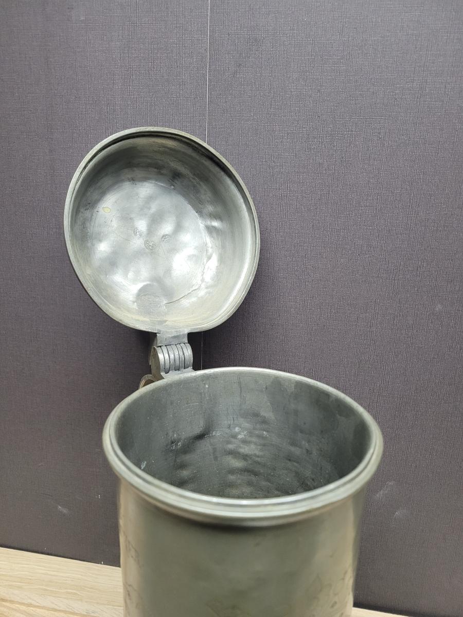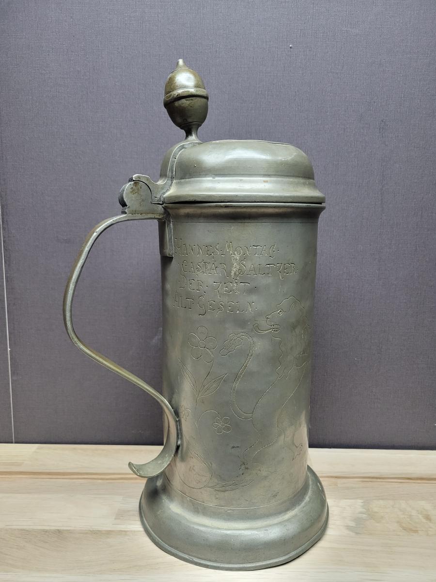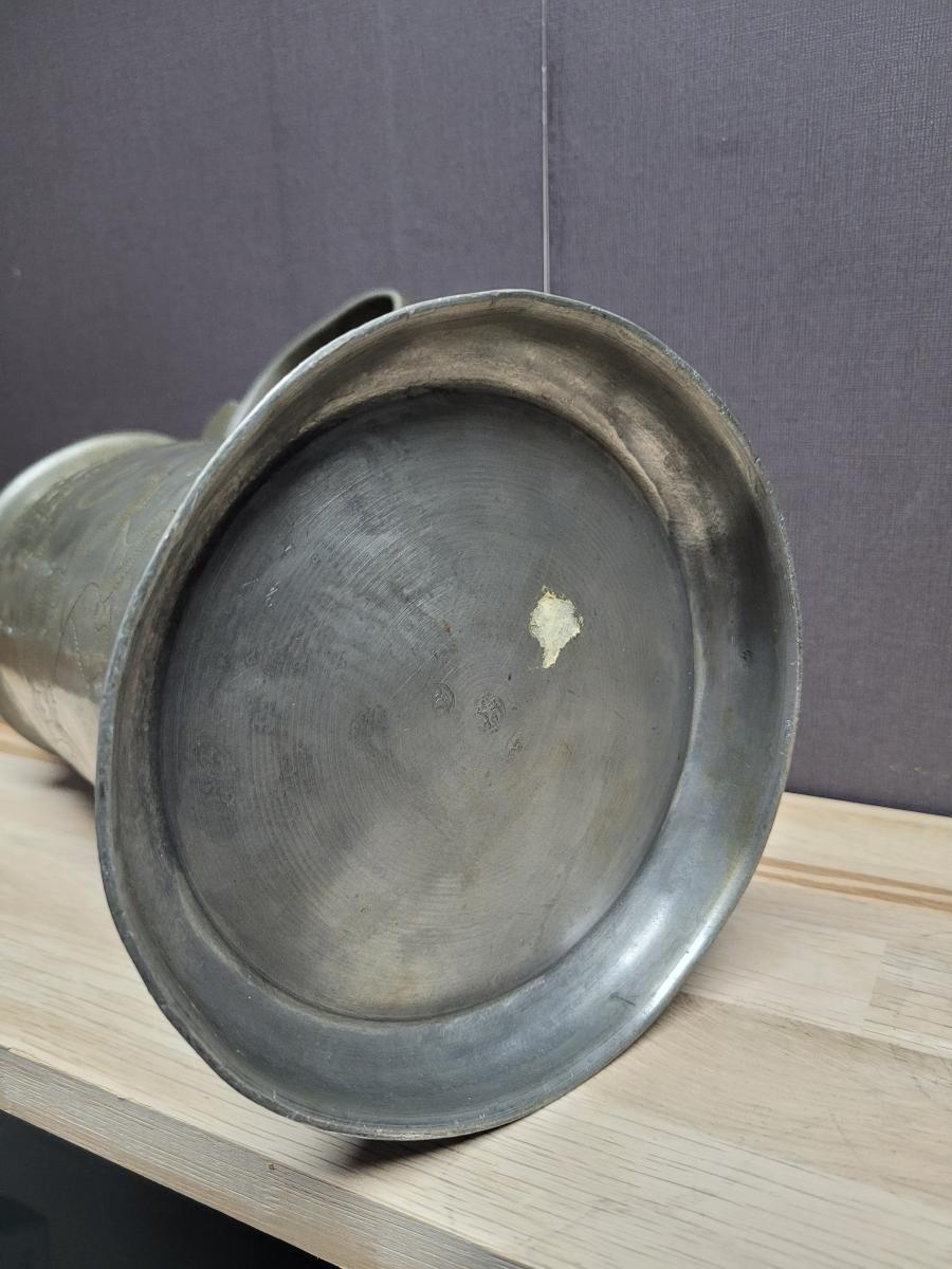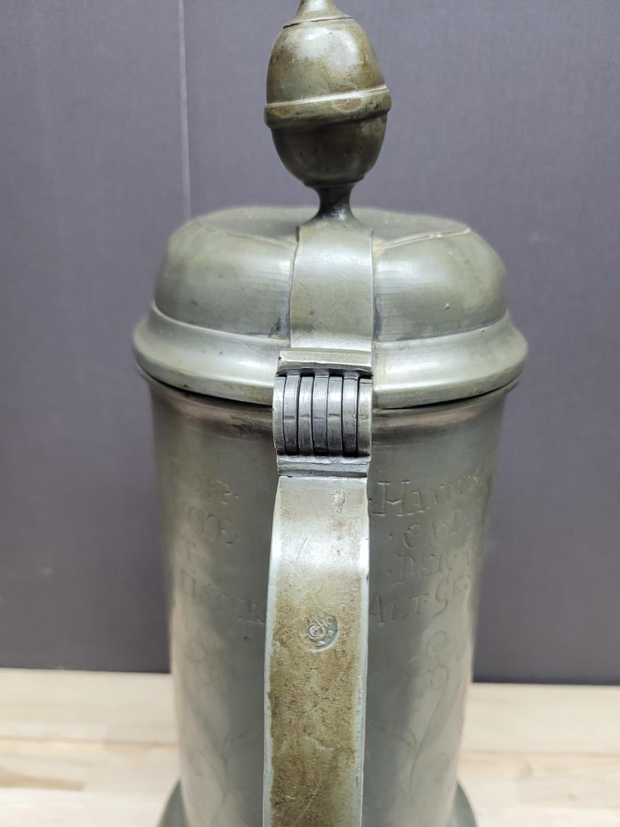 The pewter jug is 13 inches tall, including the lid and thumblift (9,25 inch without the lid). The ravages of time have been fairly gentle on its condition, but it still shows signs of wear and a few dents.