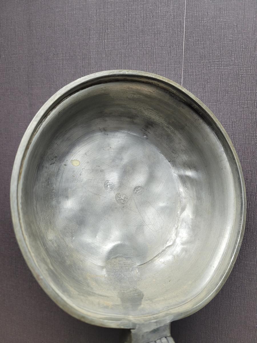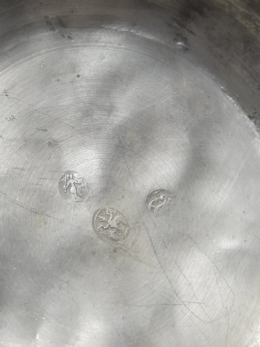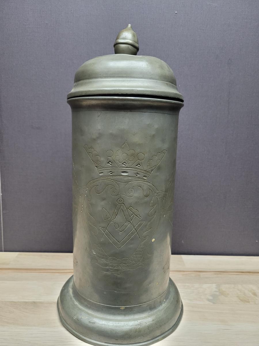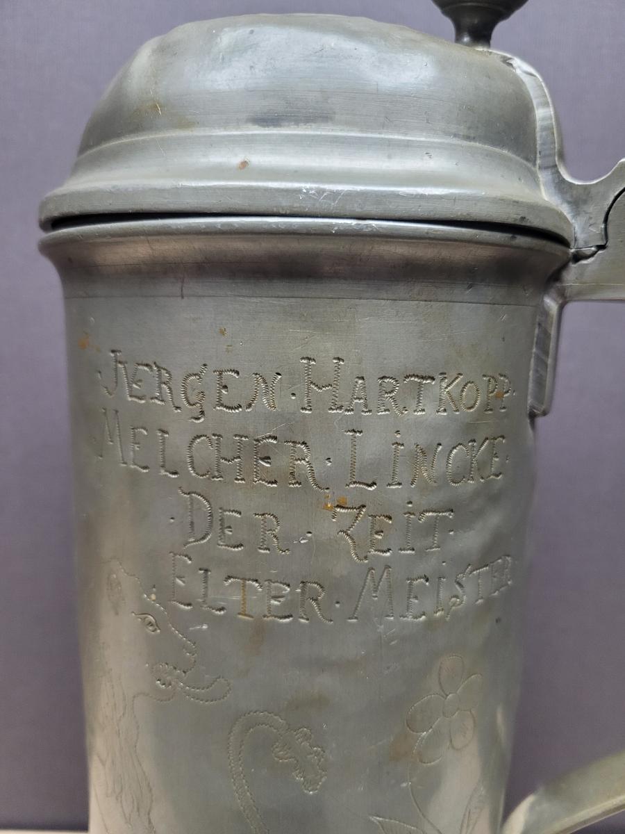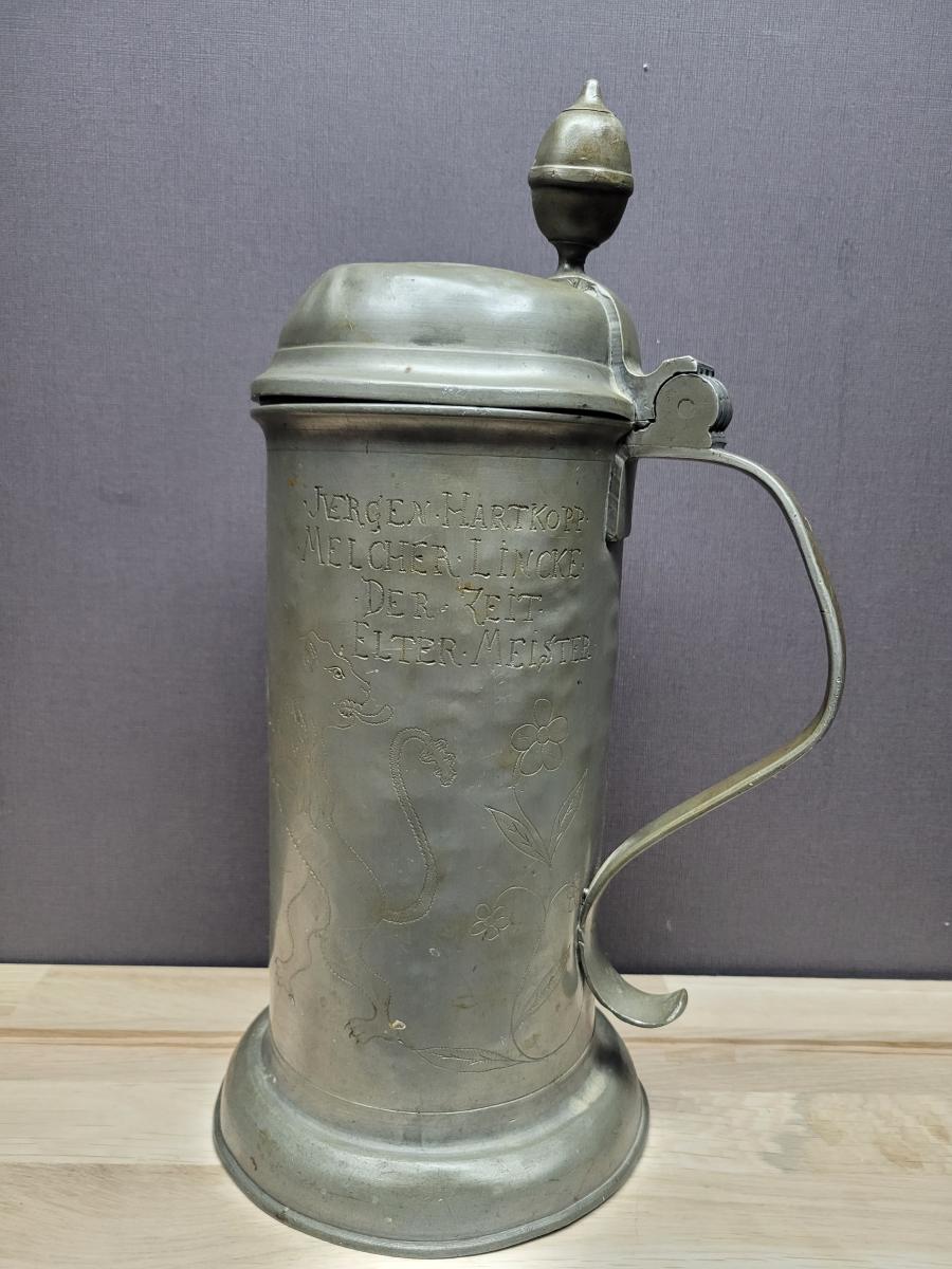 The pewter jug is 13 inches tall, including the lid and thumblift (9,25 inch without the lid). The ravages of time have been fairly gentle on its condition, but it still shows signs of wear and a few dents.