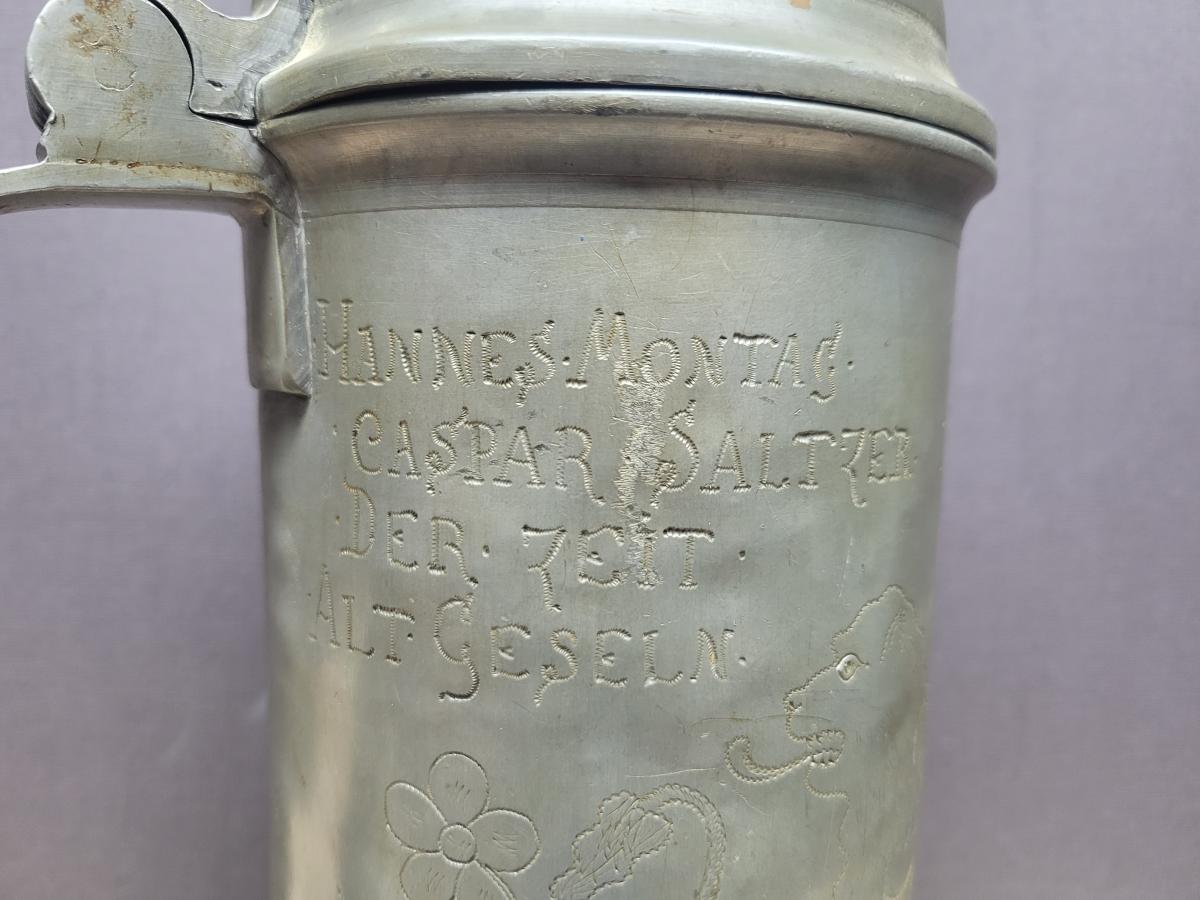 An impressive pewter tankard, made in Germany and dated 1747. However, I doubt if it really was produced back then. It could be a late 19th or early 20th century reproduction. Experts on pewterware will likely be able to tell me.