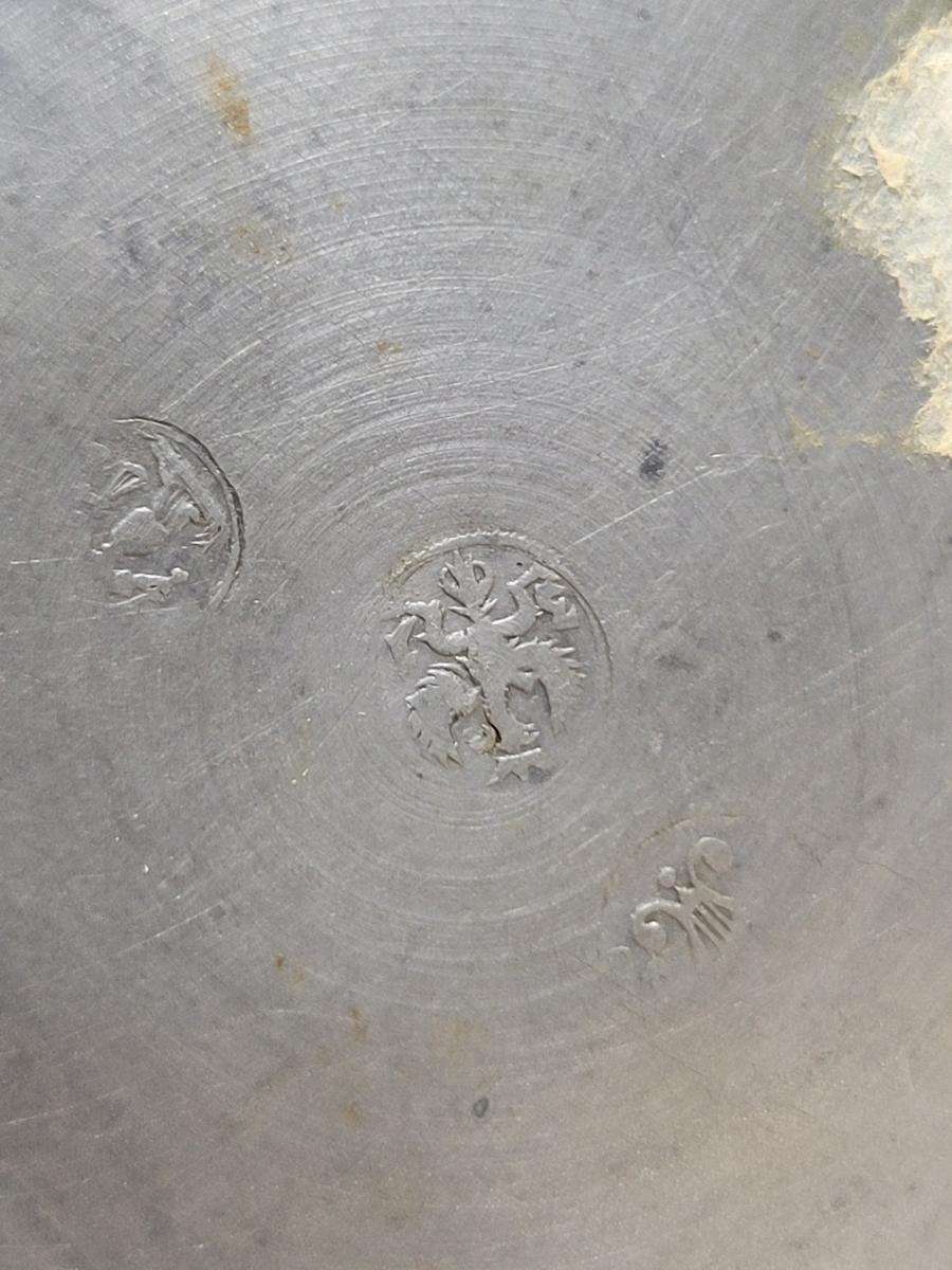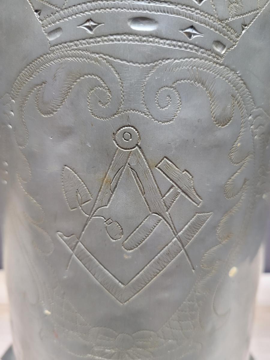 The front panel shows 2 lions holding a crowned panel. The panel features a drawing of a masonry tools: a hammer, a square, a compass, and a trowel. Interestingly, the drawing also closely resembles the Freemason's mark. So perhaps this jug also has a connection to Freemasonry. If you know more about this, please let me know.