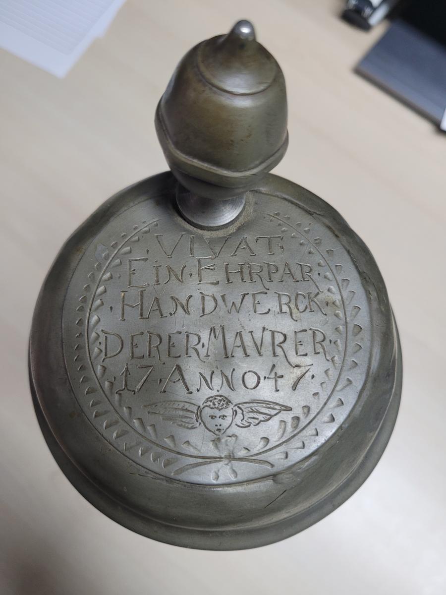 This looks to be a so-called occcupational stein, in honor of the profession of masons (German: Maurer). The texts on the sides read:
