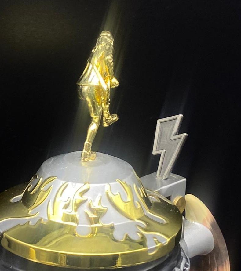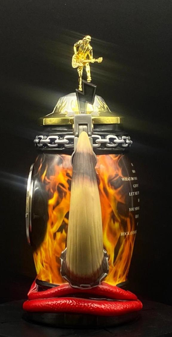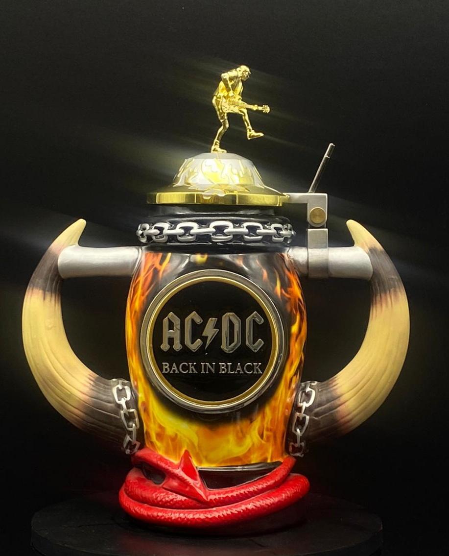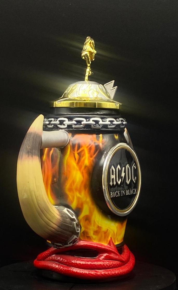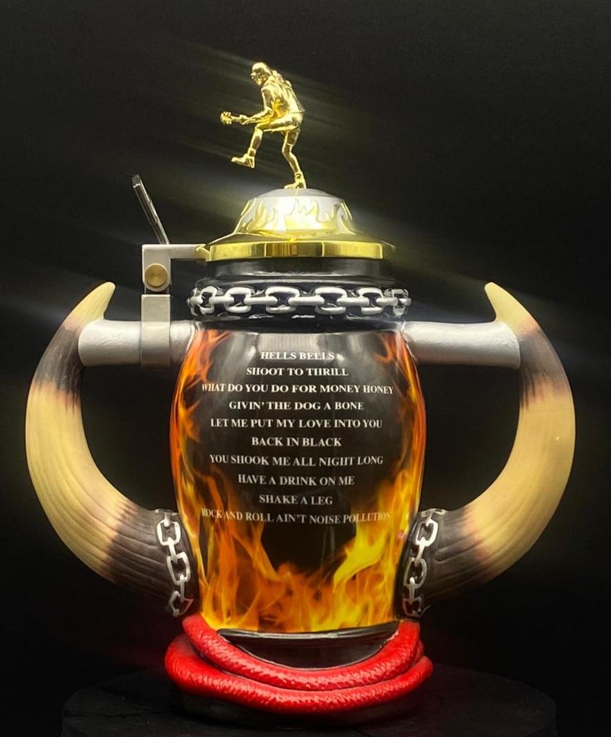 The beer pokak is handmade and decorated with bas-reliefs, including "devil horns" as handles. The beer pokal is crowned by a metal and gilt statue of the legendary guitarist Angus Young. On the front side of the bser pokal is the famous logo of the band AC/DC, and on the back is the full list of songs from the album "Back In Black" 1980, surrounded by flames. The beer pokal is made of high-quality porcelain (Heirloom Porcelain®).