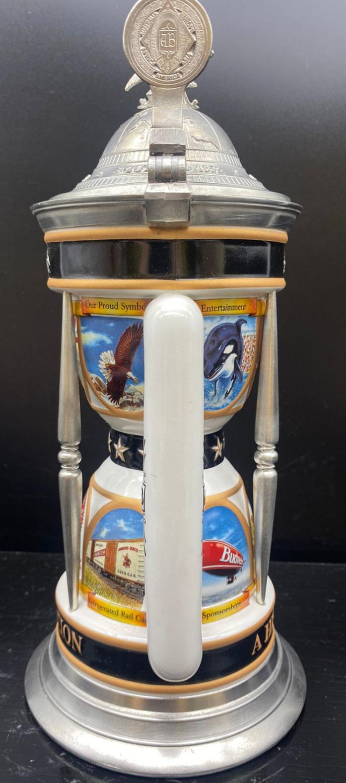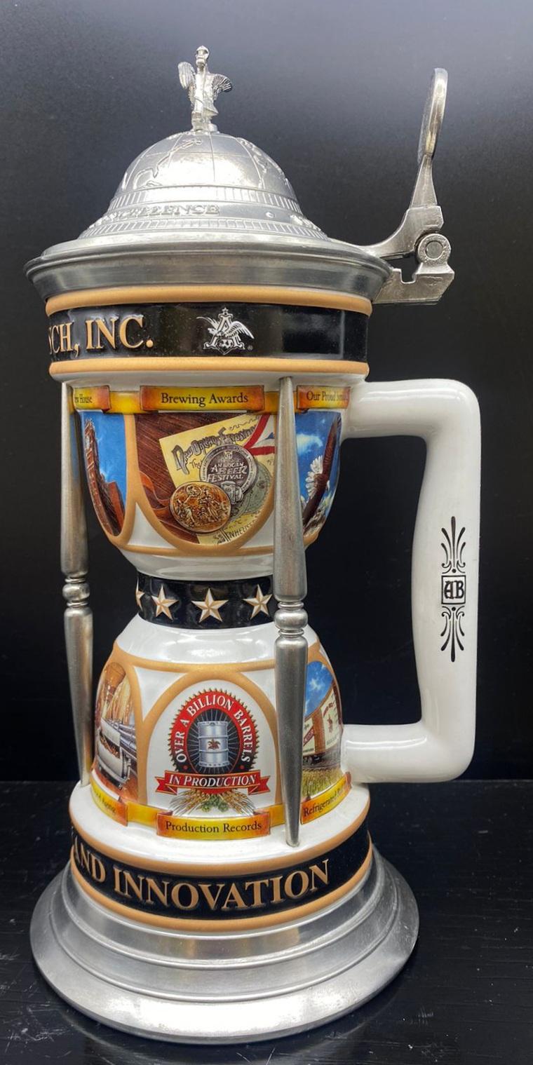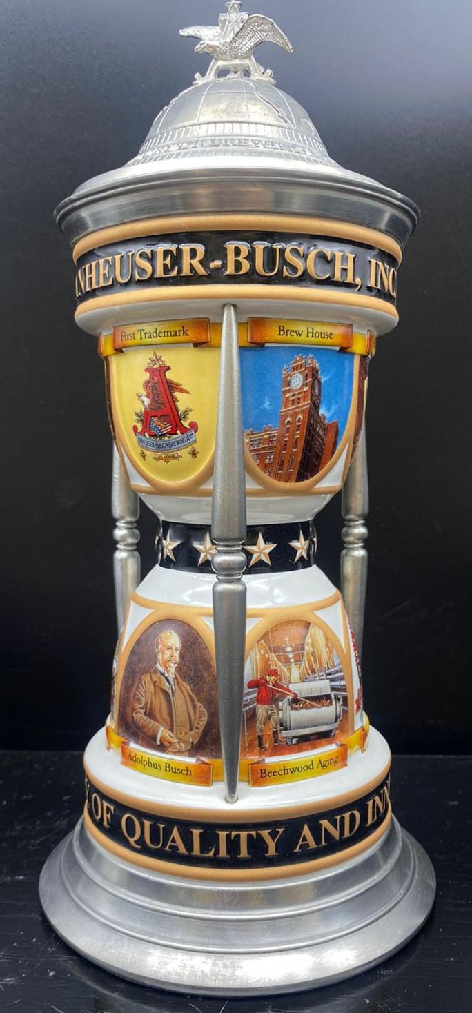 The mug has the shape of an hourglass with three tin spindles (racks) and a tin base. The lid is also tin, topped with an eagle figure. The mug depicts various historical milestones of the AB company, including the brewery building with a clock tower (which is a National Historic Landmark) and a portrait of one of the founders.