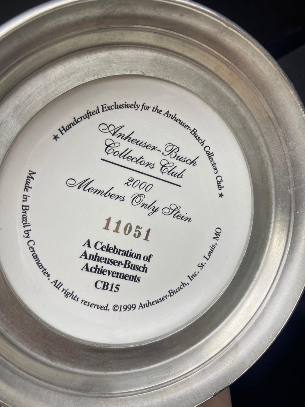 The beer mug shown in the image is a collector's item, released exclusively for members The Anheuser-Busch Collectors Club (AB) in 2000. It was made in Brazil by Ceramarte. The circle is called "A Celebration of Anheuser-Busch's Achievements".