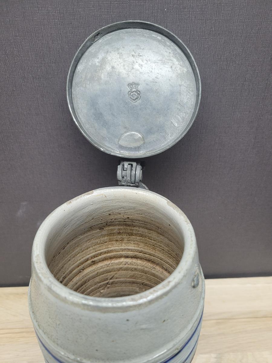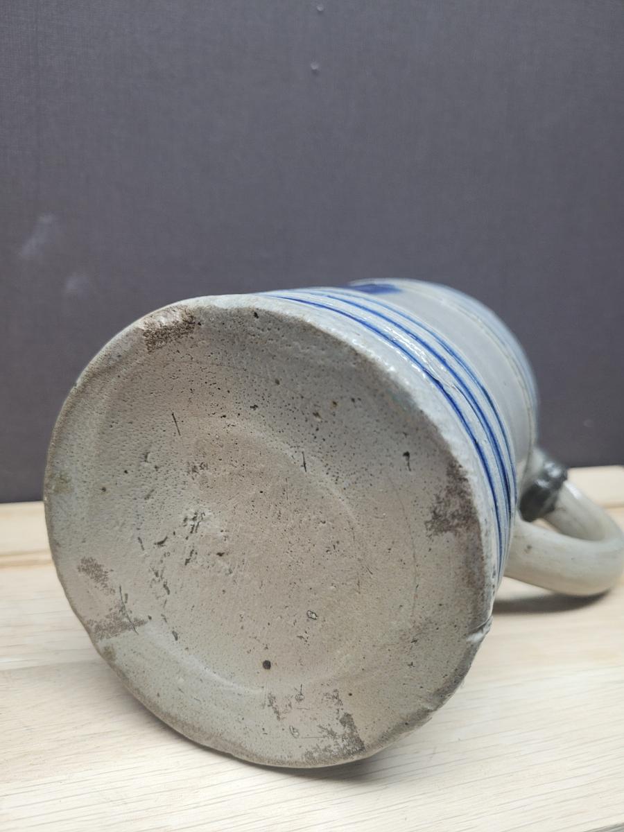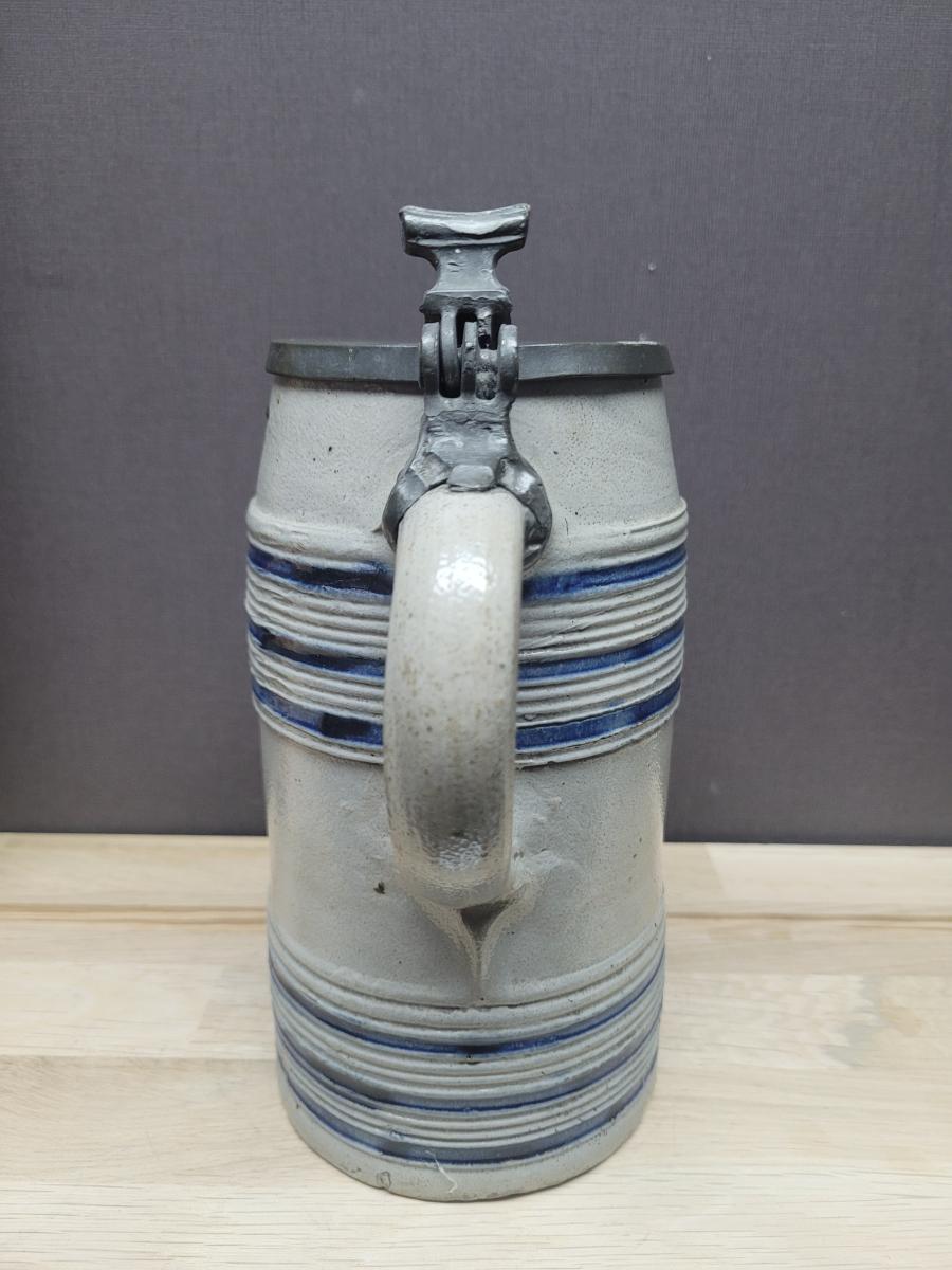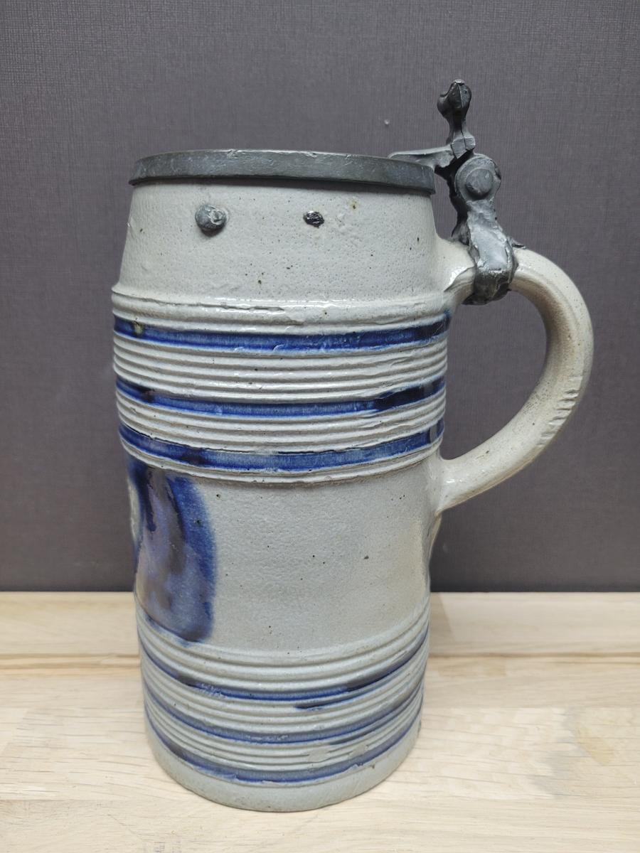 This is a nice example of a type of stein that was produced in large volumes for the 'low countries' (Belgium and the Netherlands). It is believed that production of the stoneware was in the westerwald region of Germany.